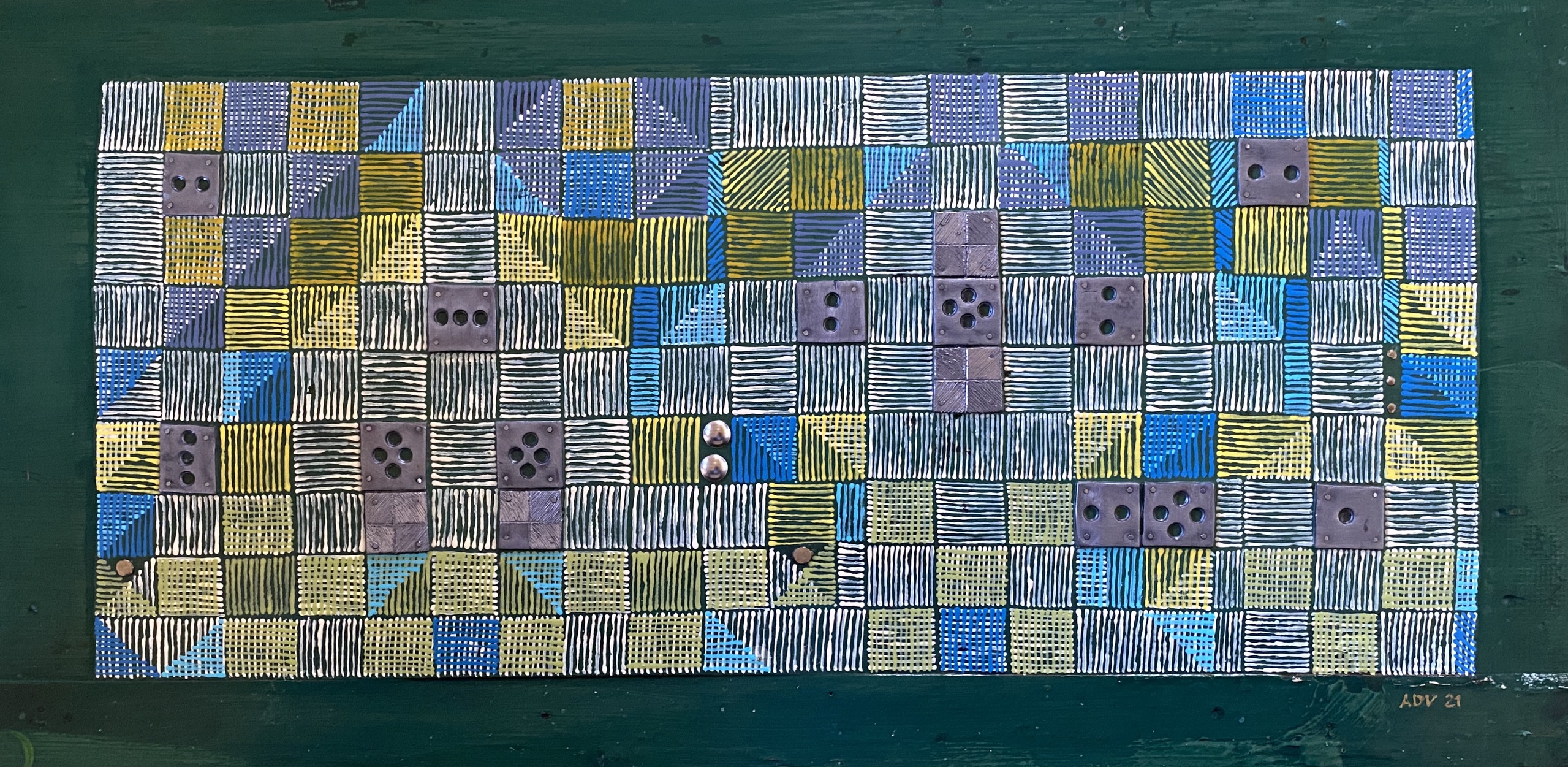 Twee plankdelen. Originele groene verf. Arceringen met penseeltje in verschillende kleuren. Toevoegingen: lood, spijkertjes, stoffeernagels. Bewerking lood met priem.