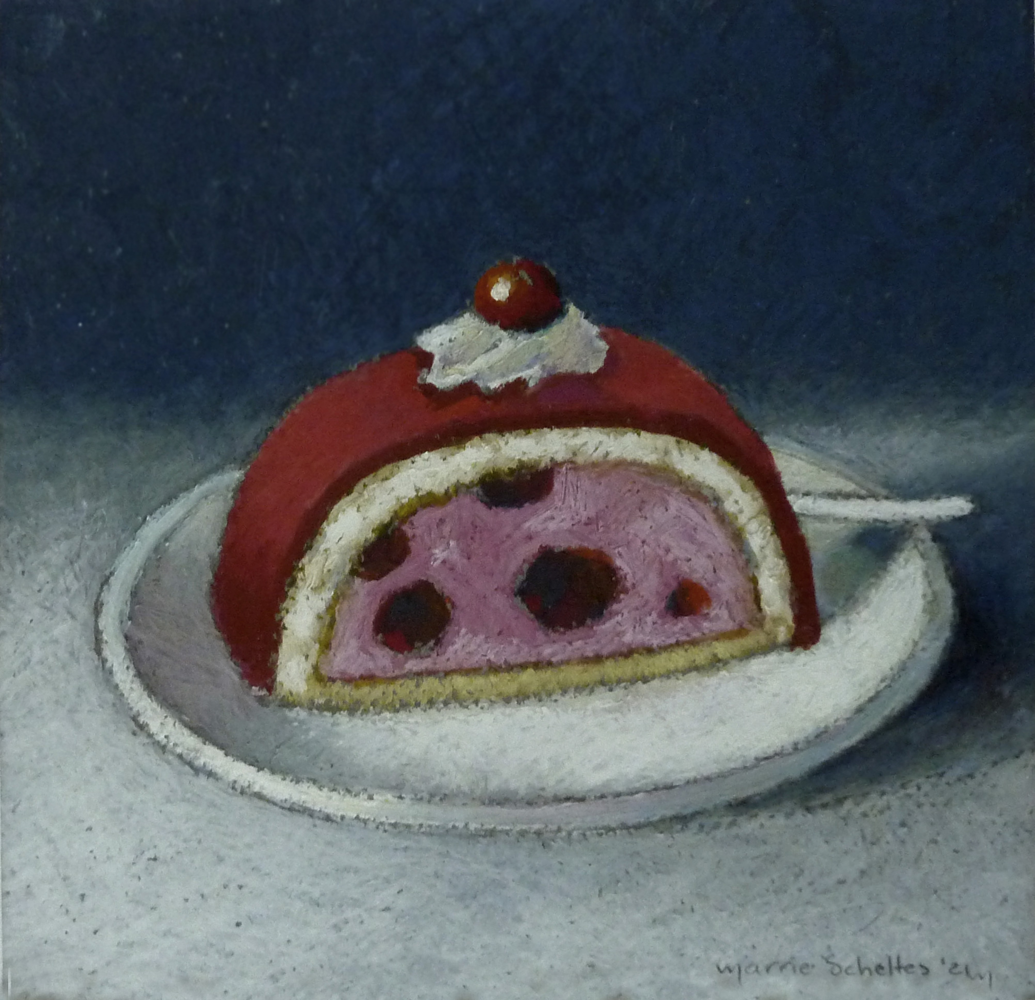 Gebakje framboos in oliepastelkrijt. passe-partout/lijstmaat 30x30 cm.