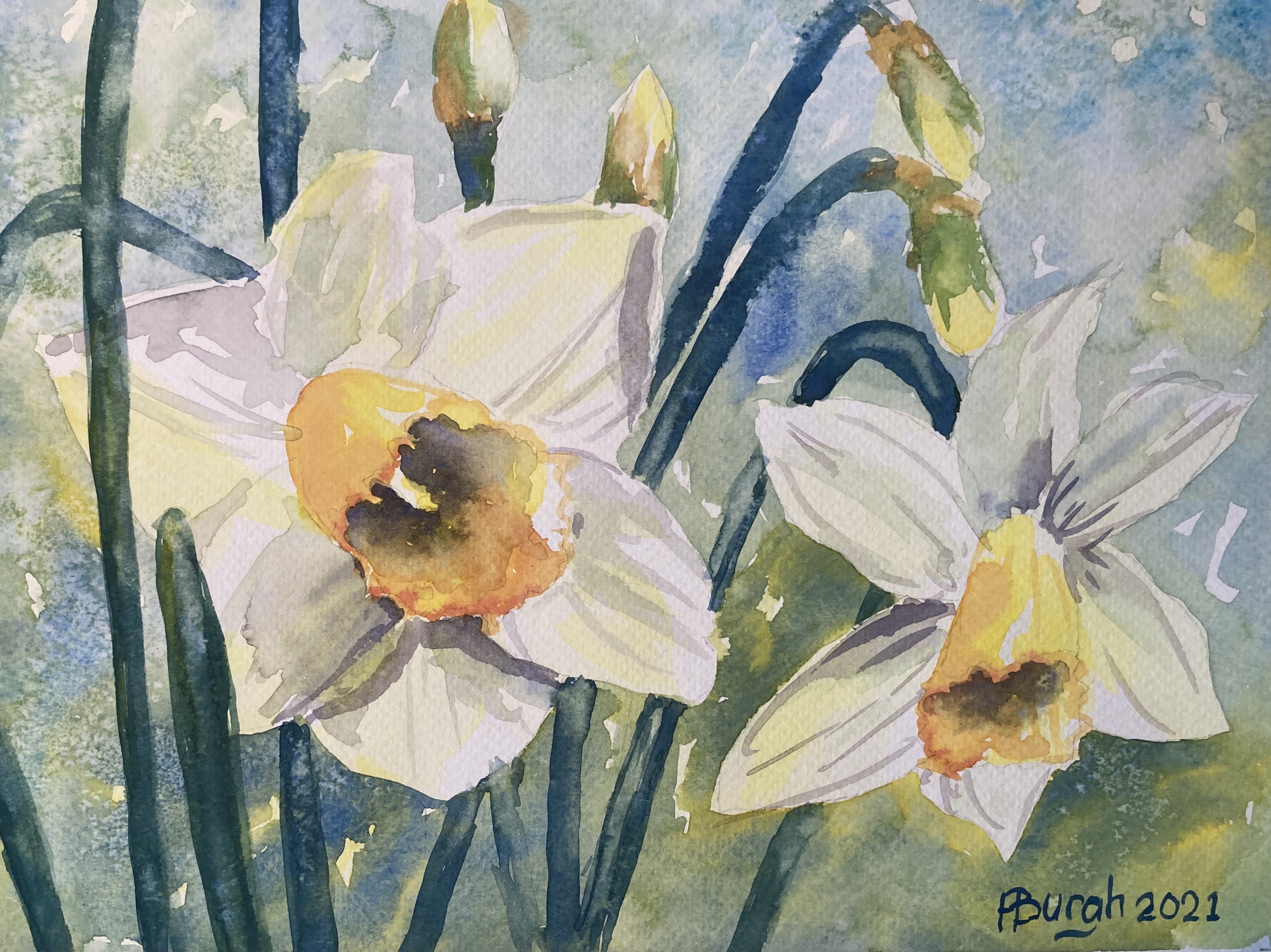 Narcissen zijn geweldig! Ze bloeien vroeg in het jaar, zijn niet duur en zijn uitdagend om te schilderen. In elke fase, zelf als ze uitgebloeid zijn, zie ik de schoonheid!