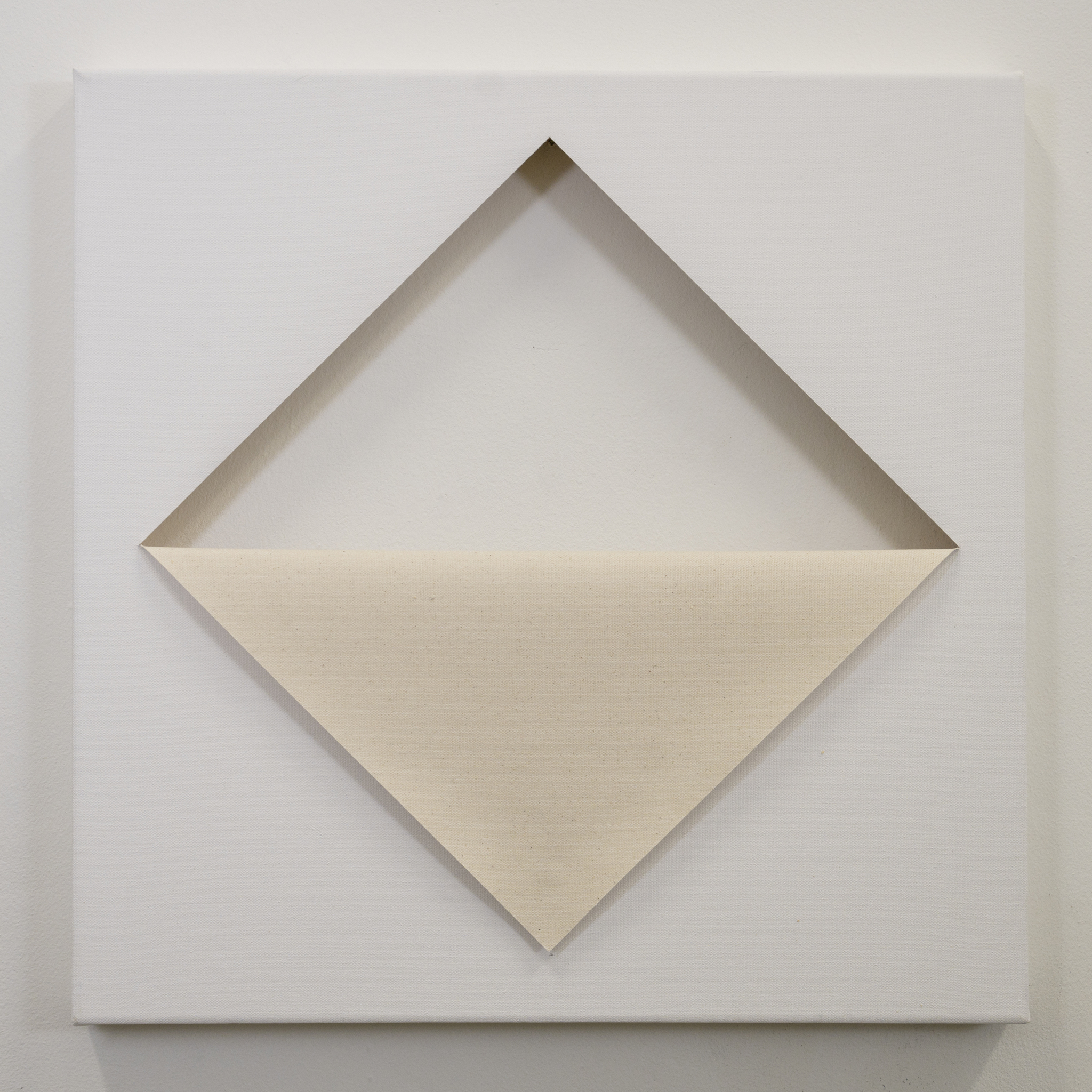 Er zijn twee sneden gemaakt in een canvas doek.De ontstane driehoek is nog bevestigd aan de lange zijde van de driehoek aan het doek.De driehoek wordt omgebogen langs deze lange zijde.Een half open vierkant en een gedeelte van de achterkant van het doek wordt nu zichtbaar.Thema's van Nico Kok komen in dit werk terug zoals: hoe is het werk gemaakt, materiaaleigenschappen, het vierkant, diagonaal, open/dicht, voor/achter, beeld/spiegelbeeld, etc. Het werk is op de achterkant gesigneerd.