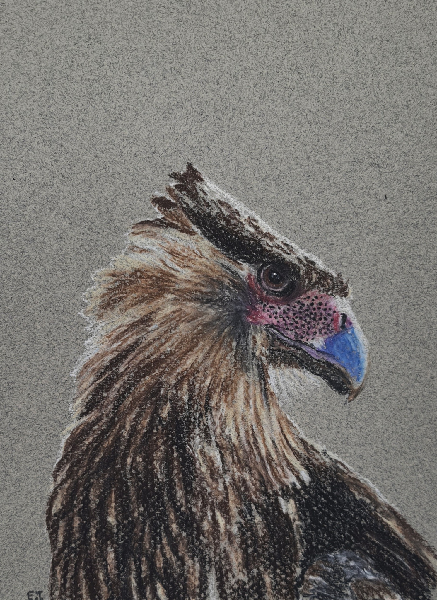 Een pastel tekening van een caracara die in een donker hoekje zit verscholen klaar om aan te vallen. De vogel komt voor in Zuid Amerika.