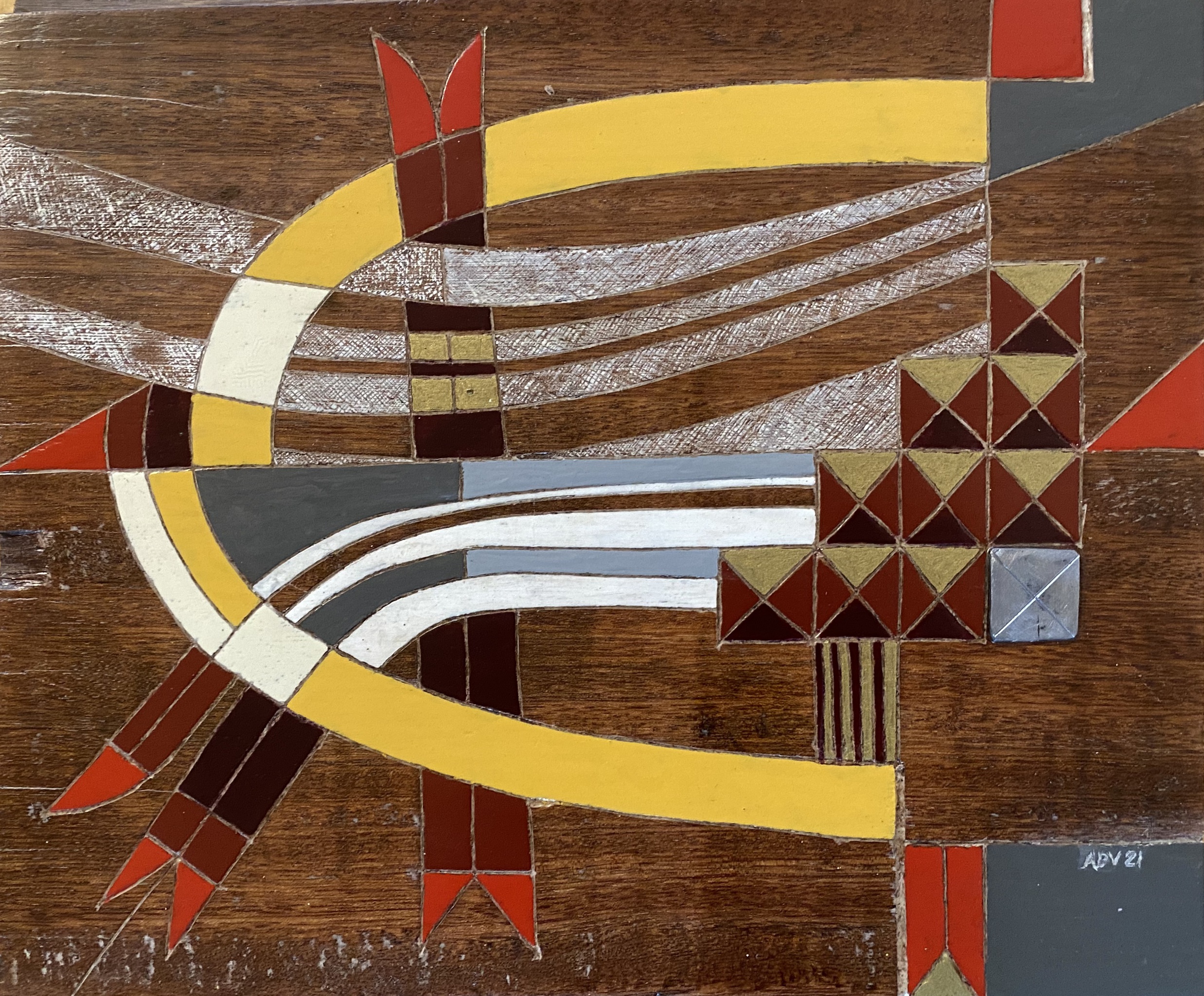 Damwandplank van hardhout. Vier cm dik, met groef en veer. Eerst heb ik lijnen in het hout gezaagd met een multitool. Lijnen opgevuld met kit. Kleuren geschilderd. Arceringen in het wit met een metaalpen. Een plaatje lood rechts op het hout gelijmd.