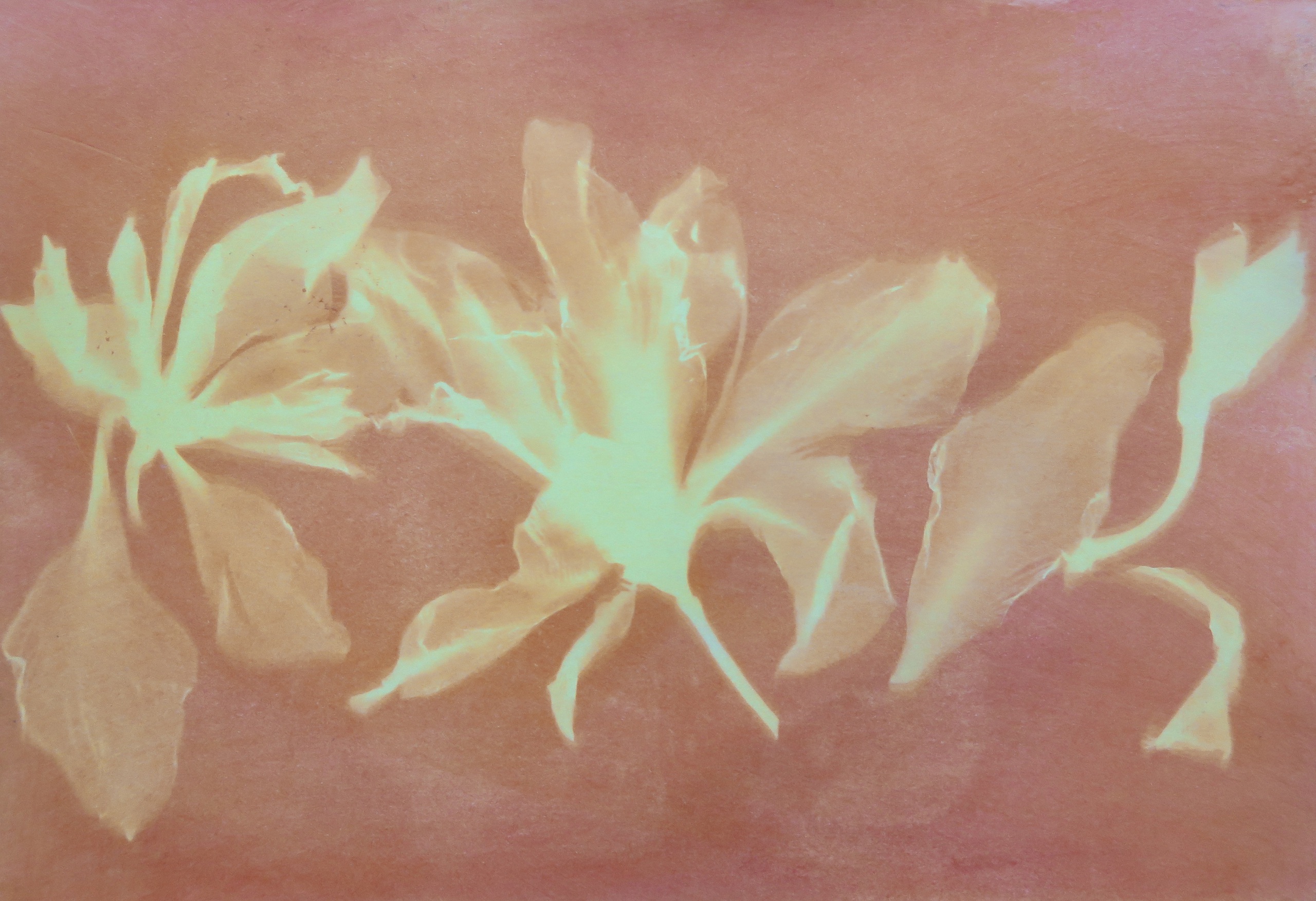 Bloemen Amaryllis Lijn Horizontaal Cameraless Fotogram Sunprint Oranje Geel Fotografie Emulsie Experiment Werk Op Papier