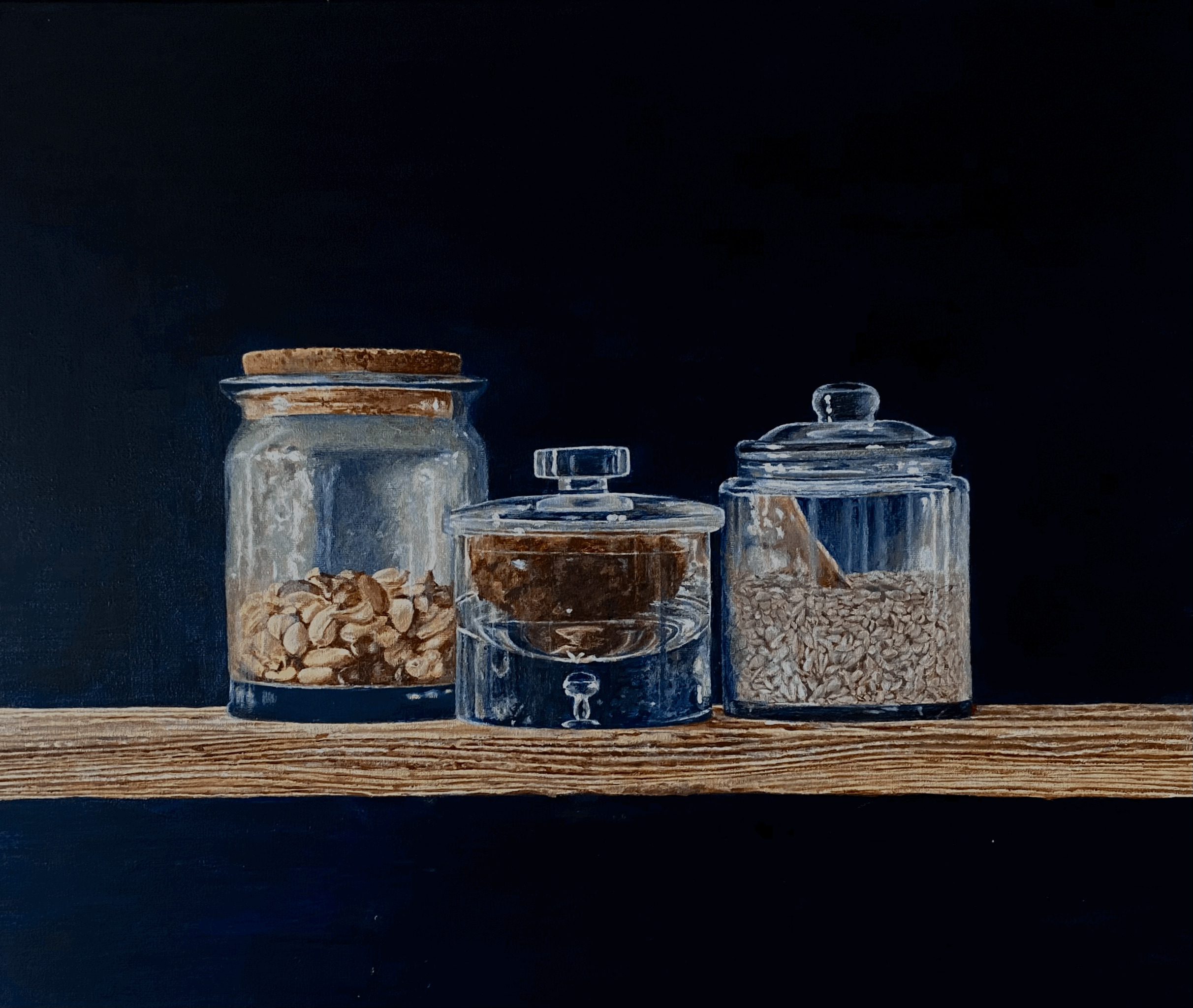 3 glazen potten met noten en pitten