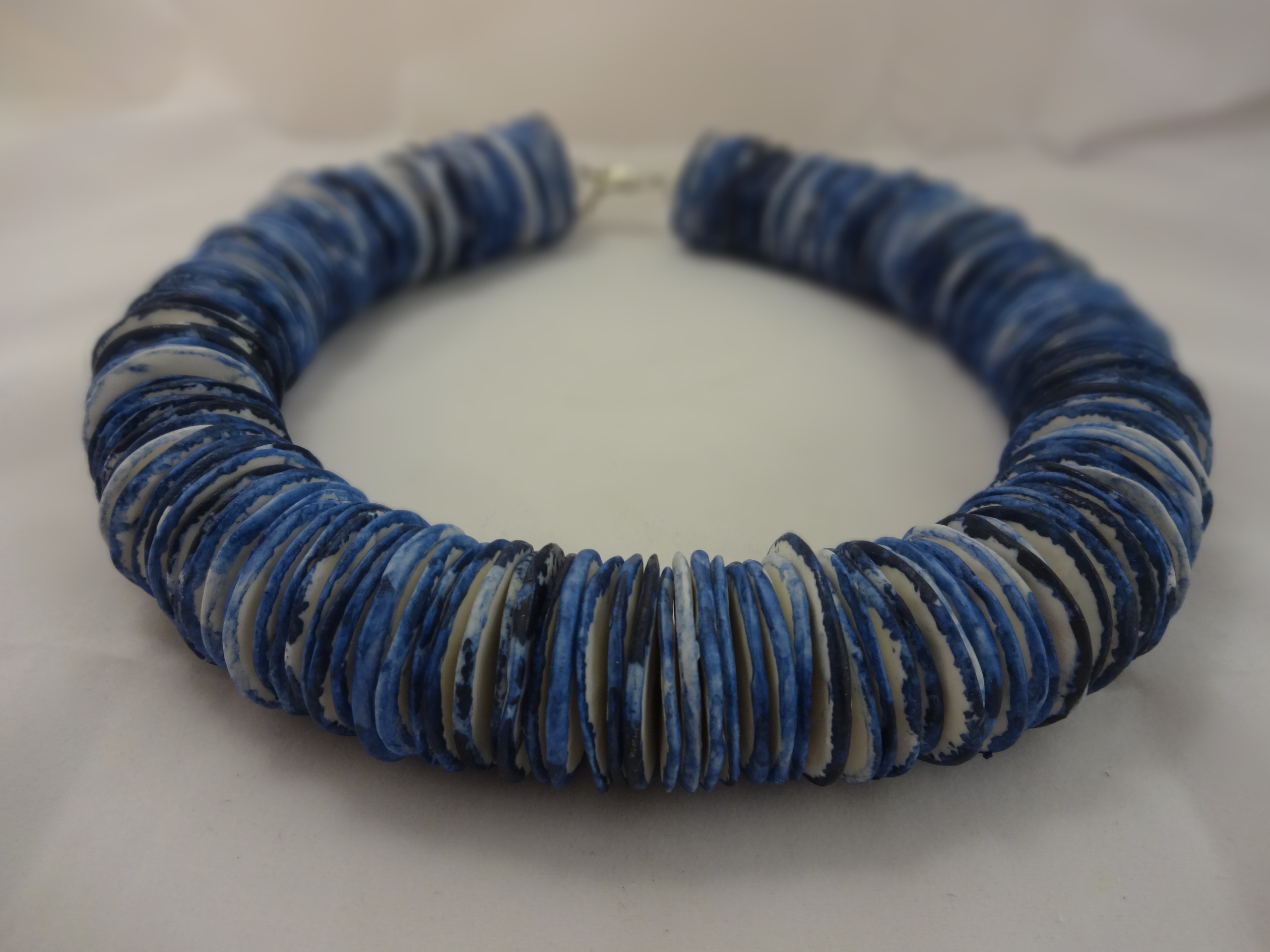 Collier gemaakt van plaatjes porselein met een afwerking in de kleur van jeans