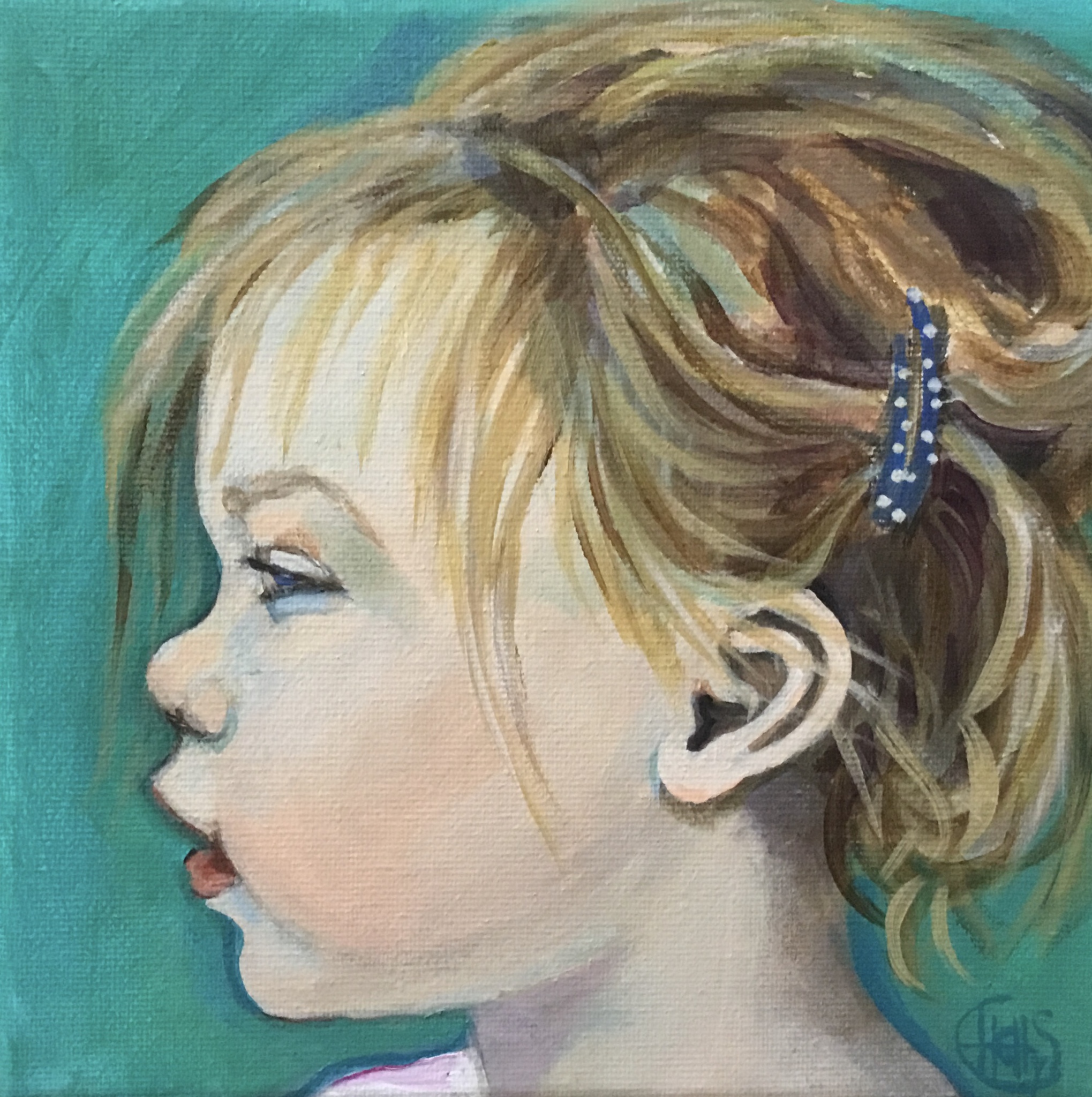 Zo een leuk gezichtje om te schilderen. Klein doekje maar dat vind ik juist erg leuk passen bij zo'n klein meisje. portret in opdracht € 125,-