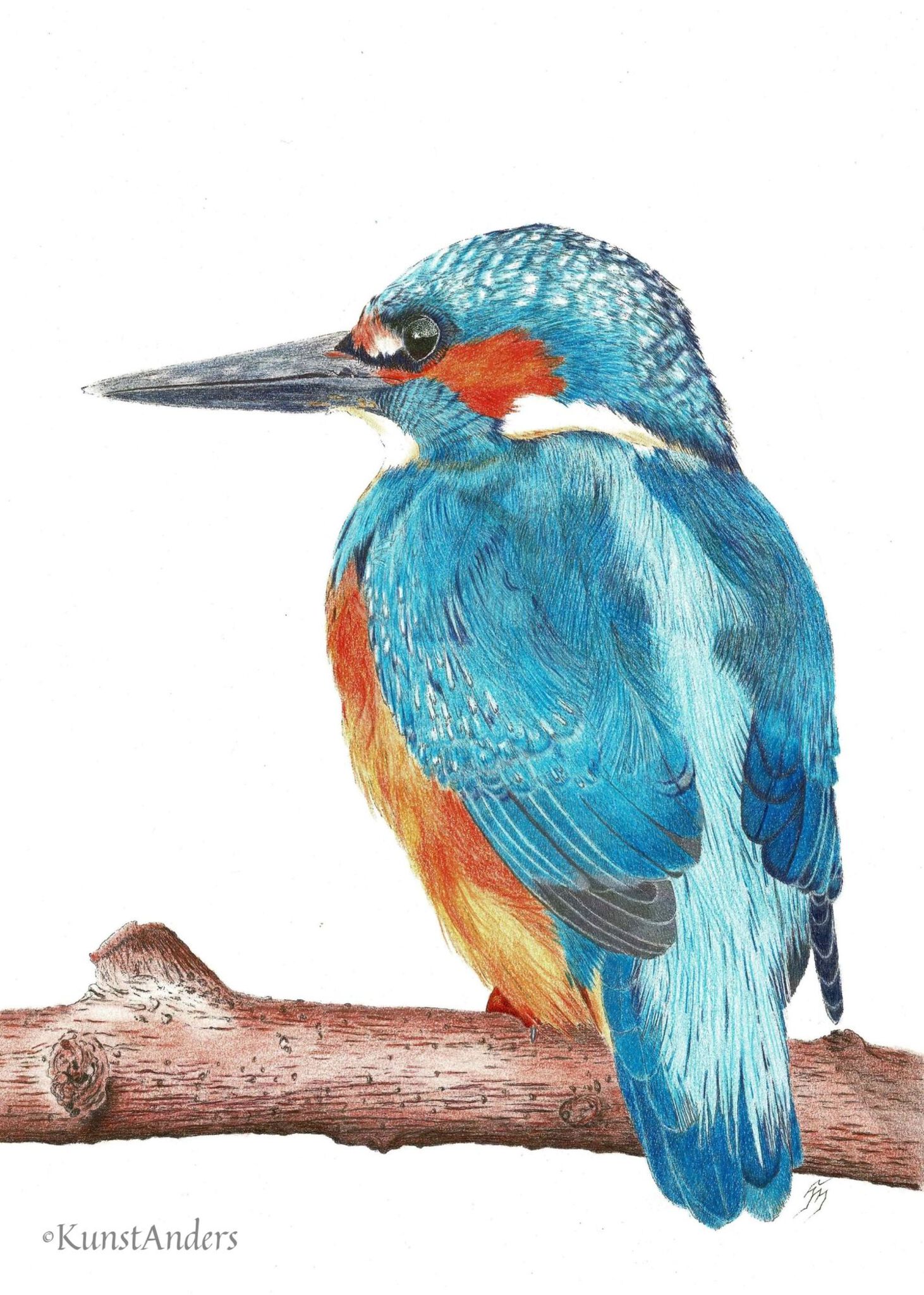 Na de pentekening van de ijsvogel (in zwart wit) nu ook een versie in kleur. Het is en blijft een klein groot wonder, dit schitterende vogeltje! Voor iedereen die een ijsvogel wel eens real life heeft mogen meemaken zal dat een bijzondere ervaring zijn geweest!