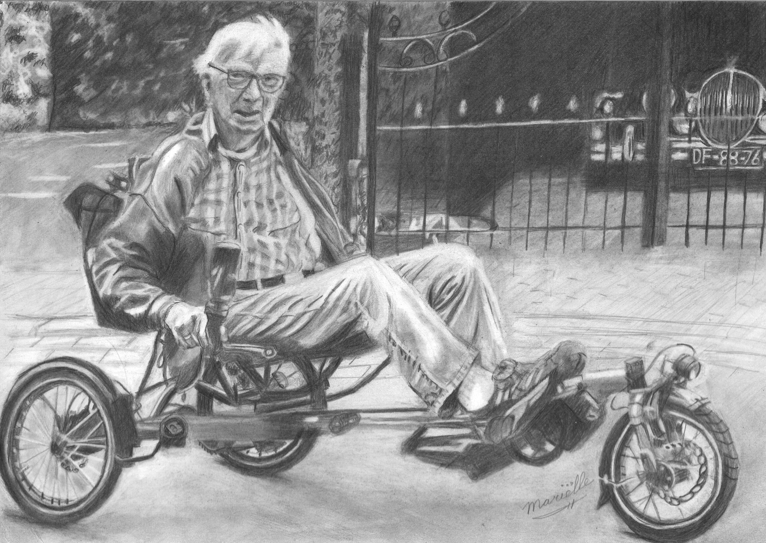 Deze man rijdt regelmatig op zijn elektrische ligfiets door de straat. Iemand die altijd opnstaat voor vernieuwingen en een luisterend oor heeft voor zijn omgeving. Met ijzel loopt deze man op Ijn ijzers door de straat, maar normaal gaat hij met de fiets naar het dorp. Whatsappt met deze en gene. Leuk om deze man in beeld te brengen
