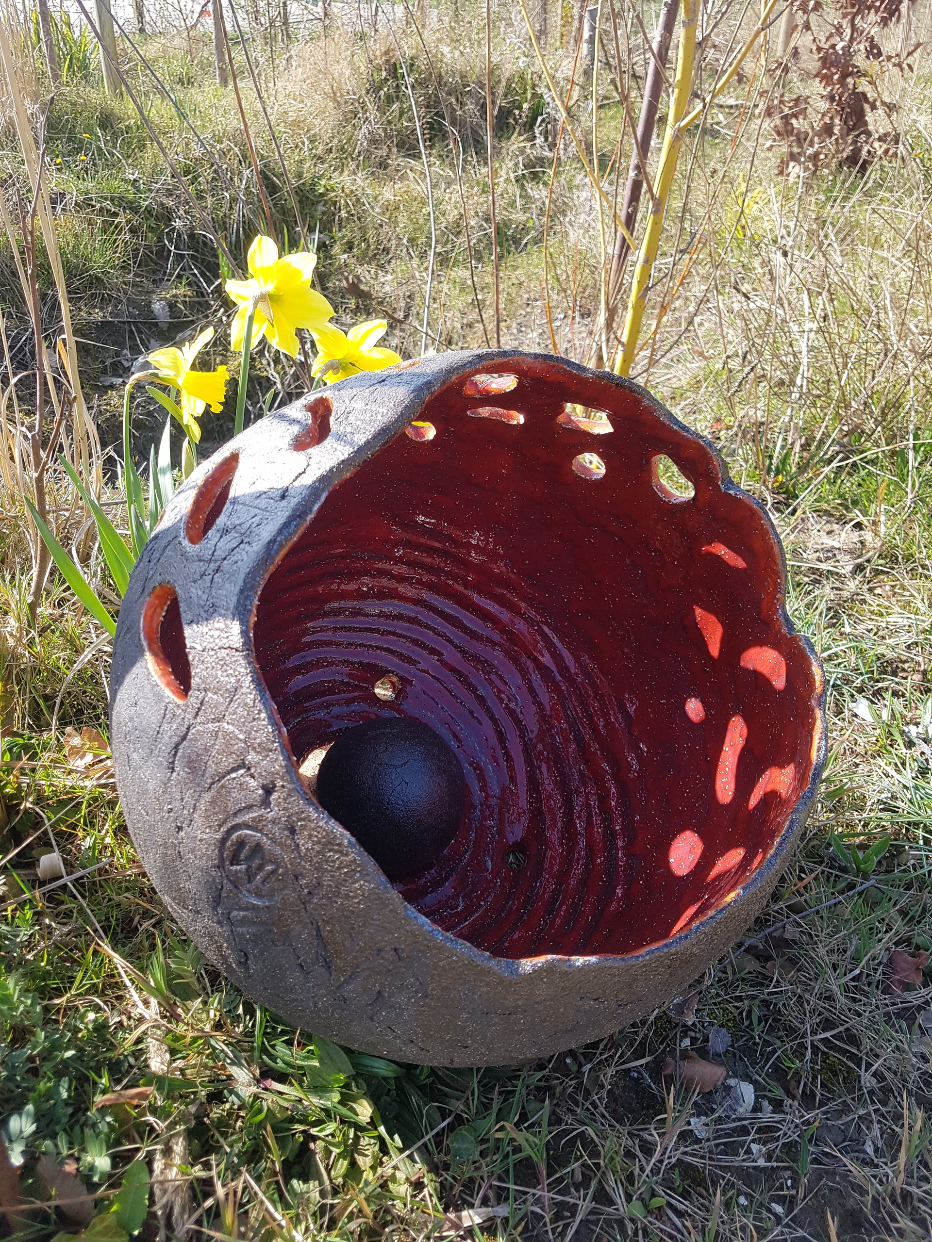 Grote bol schaal voor in de tuin met kleine bol er in. Het schaduwspel door de grote gaten maakt de schaal steeds weer anders. Van binnen donkerrood glazuur, van buiten ruw donkerbruin ongeglazuurd.