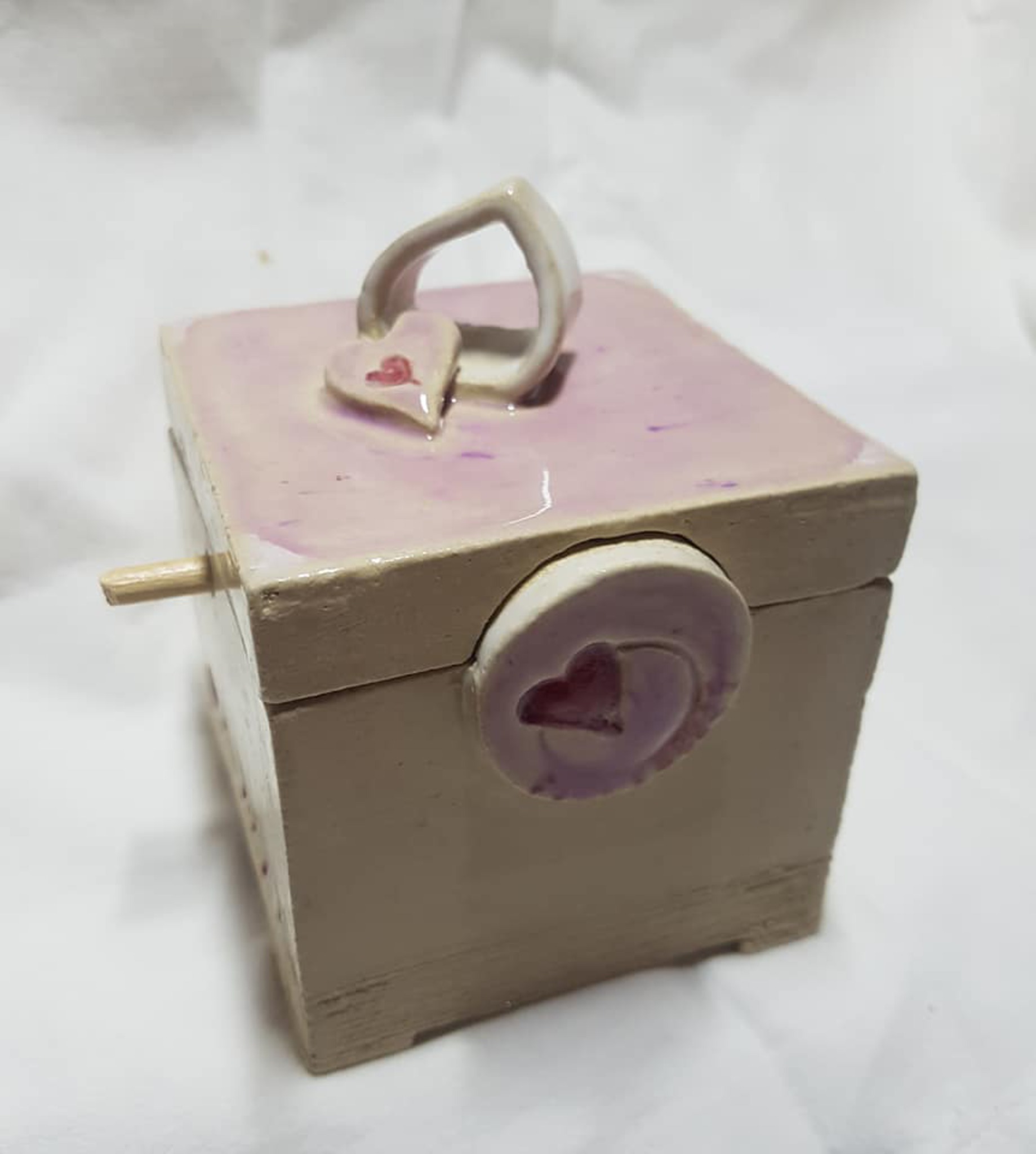 Klein doosje met zacht roze glazuur en hartje. Tekst achterop de buitenkant: Houd mij vast, dicht bij Uw hart, opw 288. binnenin het doosje een lichtje.