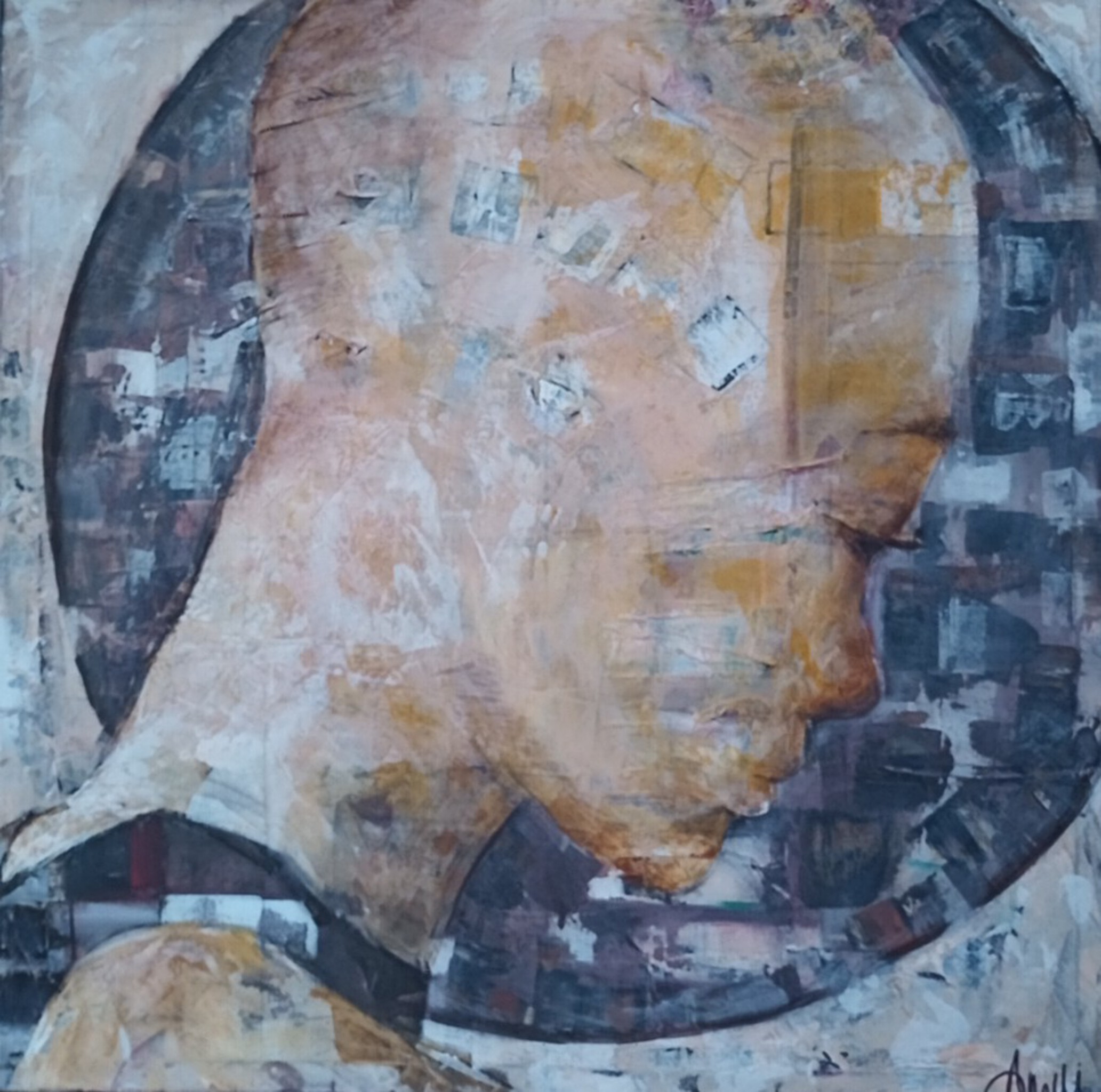 Vrouw Portret Figuratief Groot Acryl Mixen Media Etnisch Cultureel Bruin Wit Rond