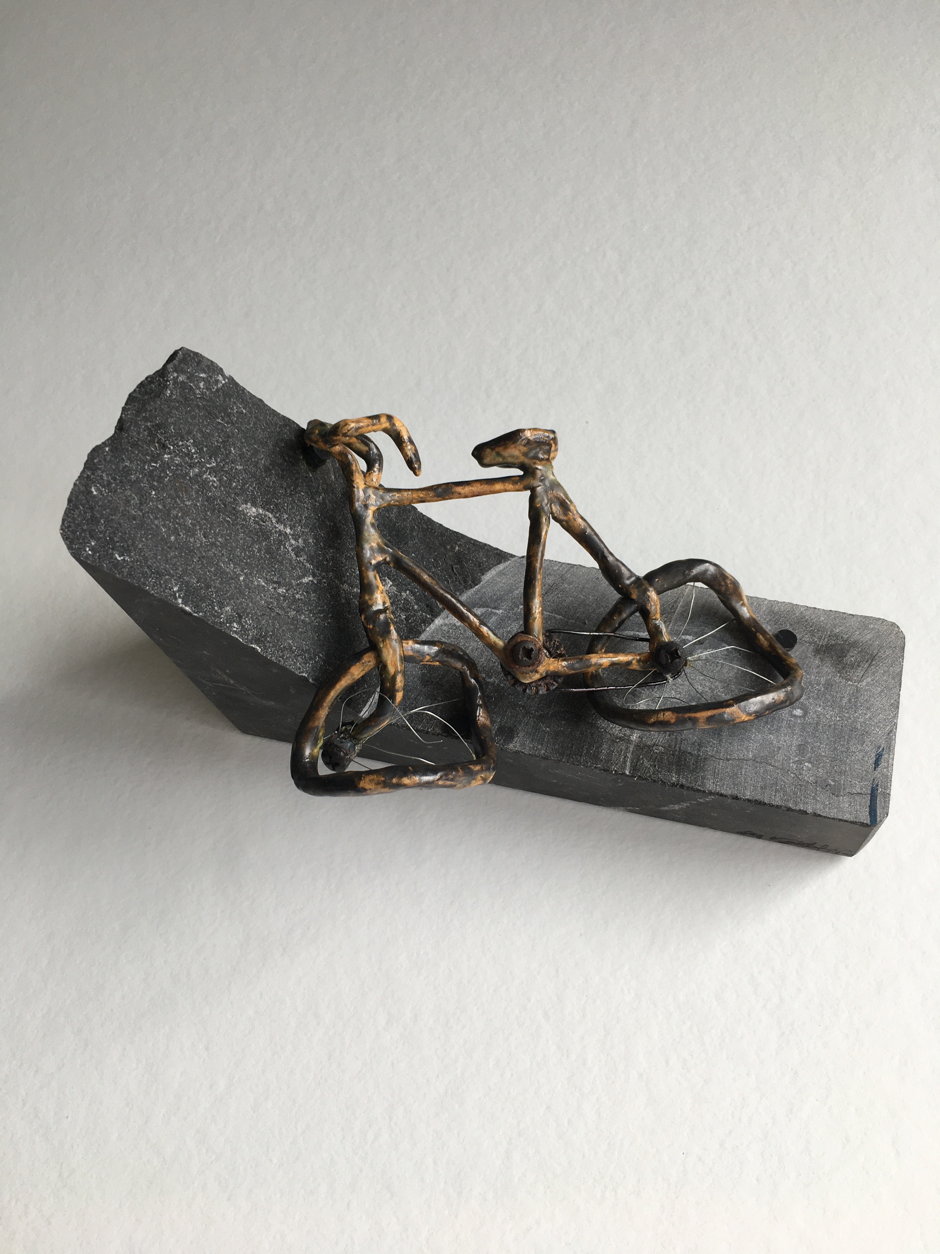 Keramiek kunstwerk. "Ode aan de vergeten fiets" unica. Gemaakt voor de Kunst-Fietsroute Middelburg 2018. Beeldje (miniatuur) in keramiek, van een gebroken fiets liggend op een natuursteen (als sokkel). Mixed media. Metaal, keramiek, schroefjes,moertjes. Geglazuurd en twee keer in een keramiek oven gestookt. Gesigneerd. Kunstenaar Ena van Bockel Rivera. 2018. De afmetingen zijn voor de fiets. verkocht