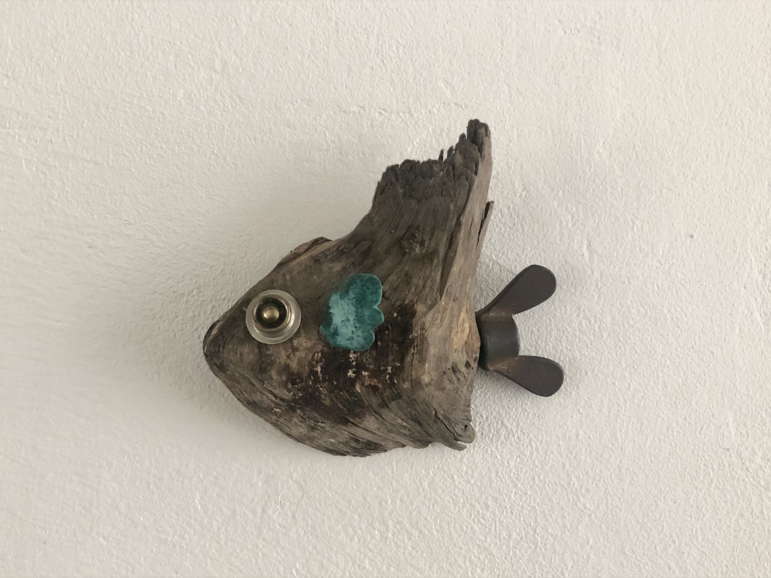 Maakt vissen. Vissen van drijfhout, wrakhout, vindhout en zaagafval. En natuurlijk oude verfblikken, koperen meuk, moertjes, knopen en alles wat verder nog onder schroot valt. En beleeft daar een kinderlijk plezier aan.