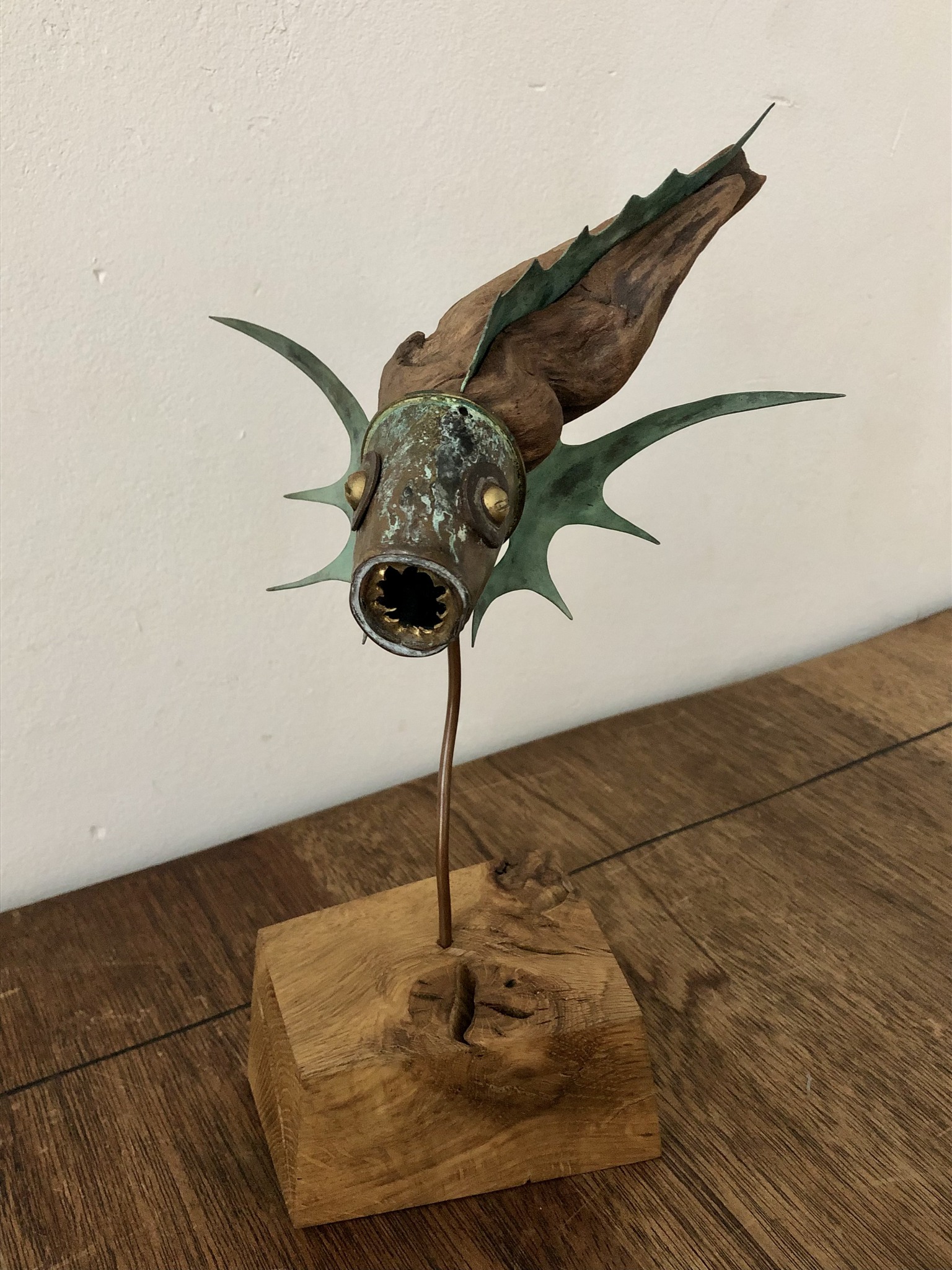 Maakt vissen. Vissen van drijfhout, wrakhout, vindhout en zaagafval. En natuurlijk oude verfblikken, koperen meuk, moertjes, knopen en alles wat verder nog onder schroot valt. En beleeft daar een kinderlijk plezier aan.