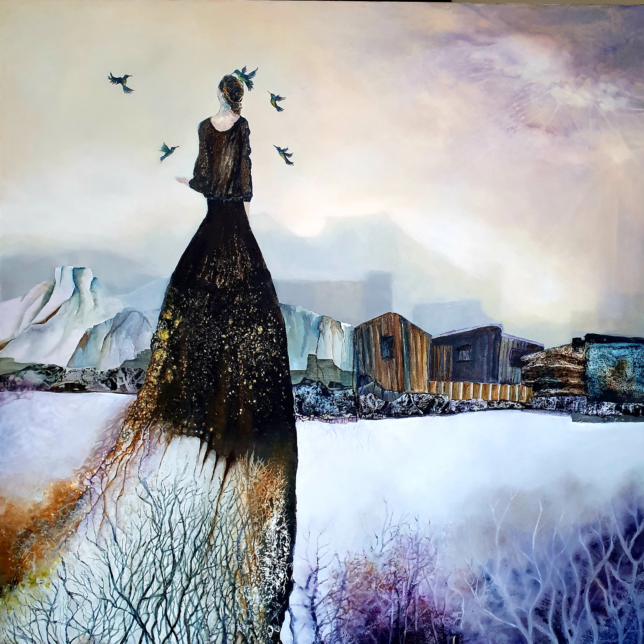 Landschap Oker Geel Groen Mosgroen Vogels Paars Vrouw Kleurrijk Figuur Sprookje Fantasie