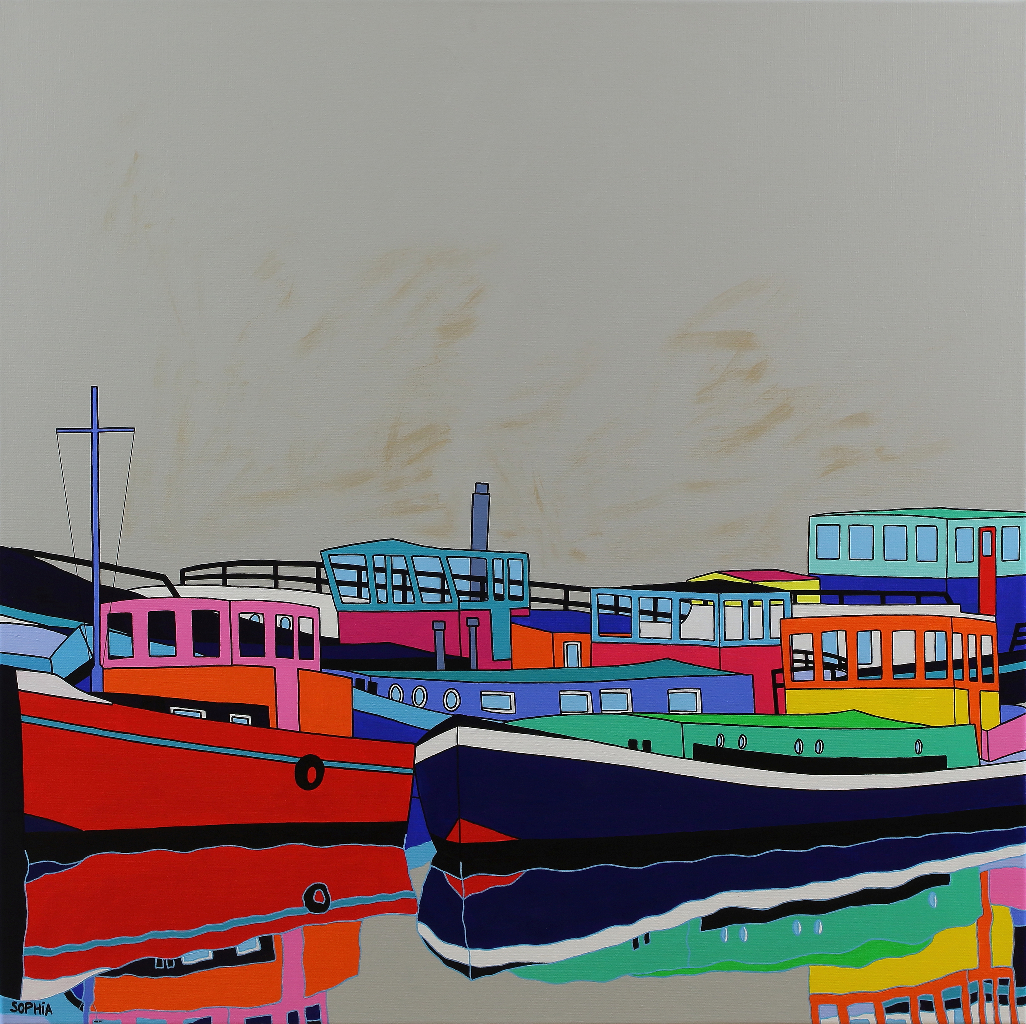 Wit Zee Figuratief Grijs Modern Rood Oranje Geel Zwart Blauw Rose Goud Groen Water Vrolijk Weerspiegeling Haven Reflectie Speels Hedendaags Boten Schepen Naief Kade