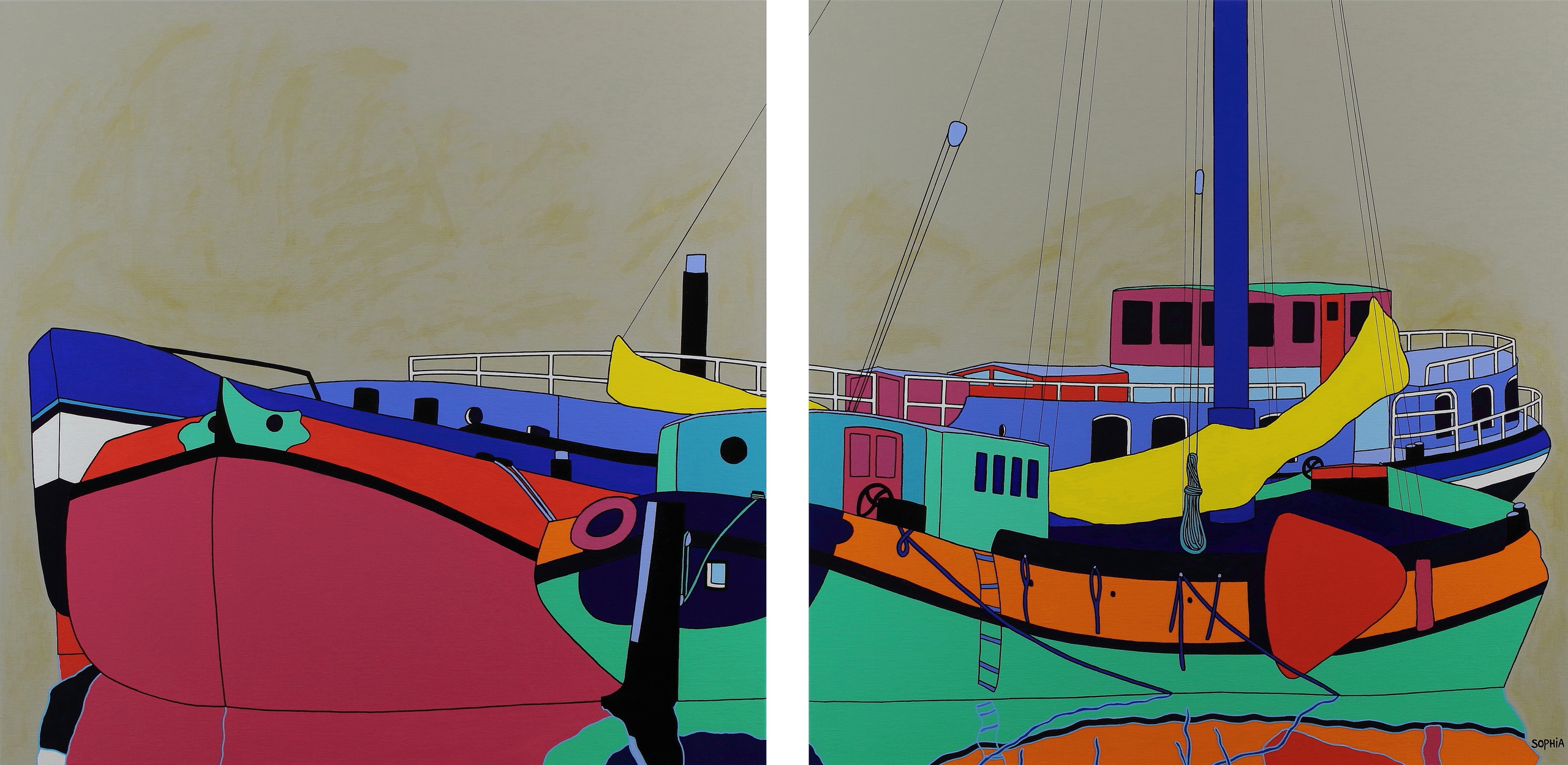 Wit Figuratief Grijs Modern Rood Oranje Geel Zwart Blauw Rose Goud Groen Tweeluik Kleurrijk Vrolijk Hedendaags Mast Boten Schepen Magenta Naief Speel Rede
