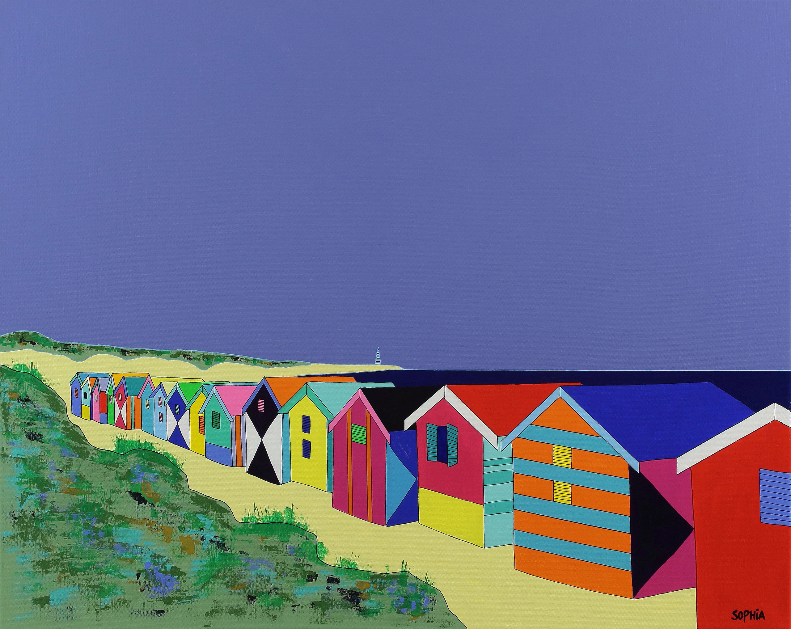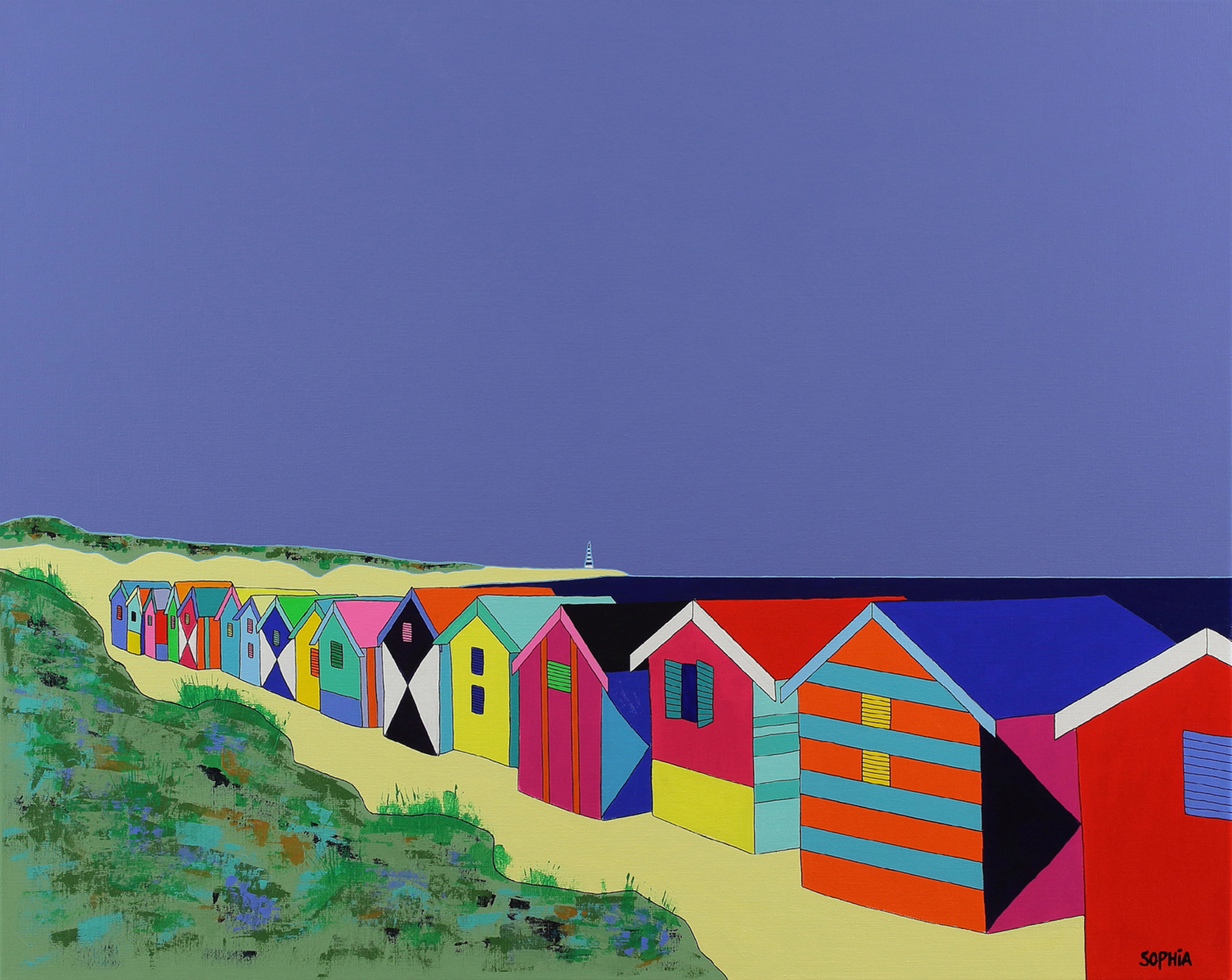 Een zonnig schilderij met strandhuisjes. Het schilderij is afgewerkt met een vernislaag. De zijkanten van het werk zijn meegeschilderd. Het schilderij heeft een houten frame met ophangkabel.