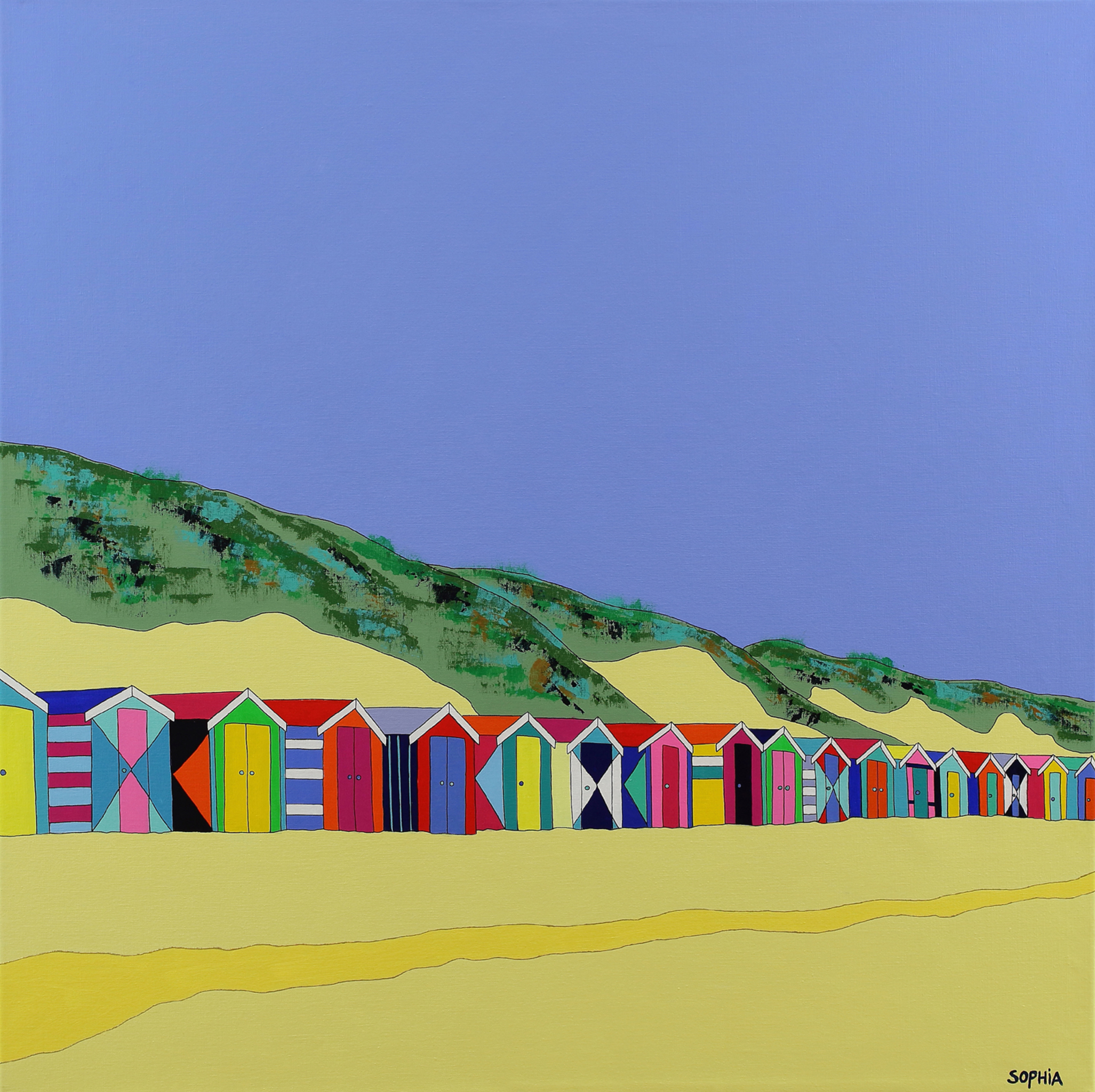 Wit Zee Strand Figuratief Modern Rood Oranje Geel Zwart Blauw Goud Groen Water Kleurrijk Roze Duinen Rust Speels Ruimte Huisjes Hedendaags Zand Magenta Naief