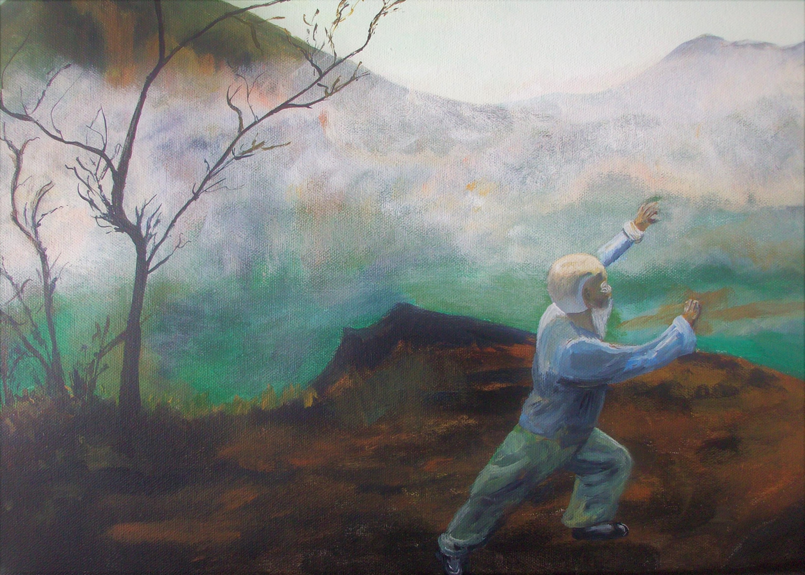 De Tai-Chi leraar beweegt vloeiend van de ene beweging naar de andere. Het landschap is idyllisch.