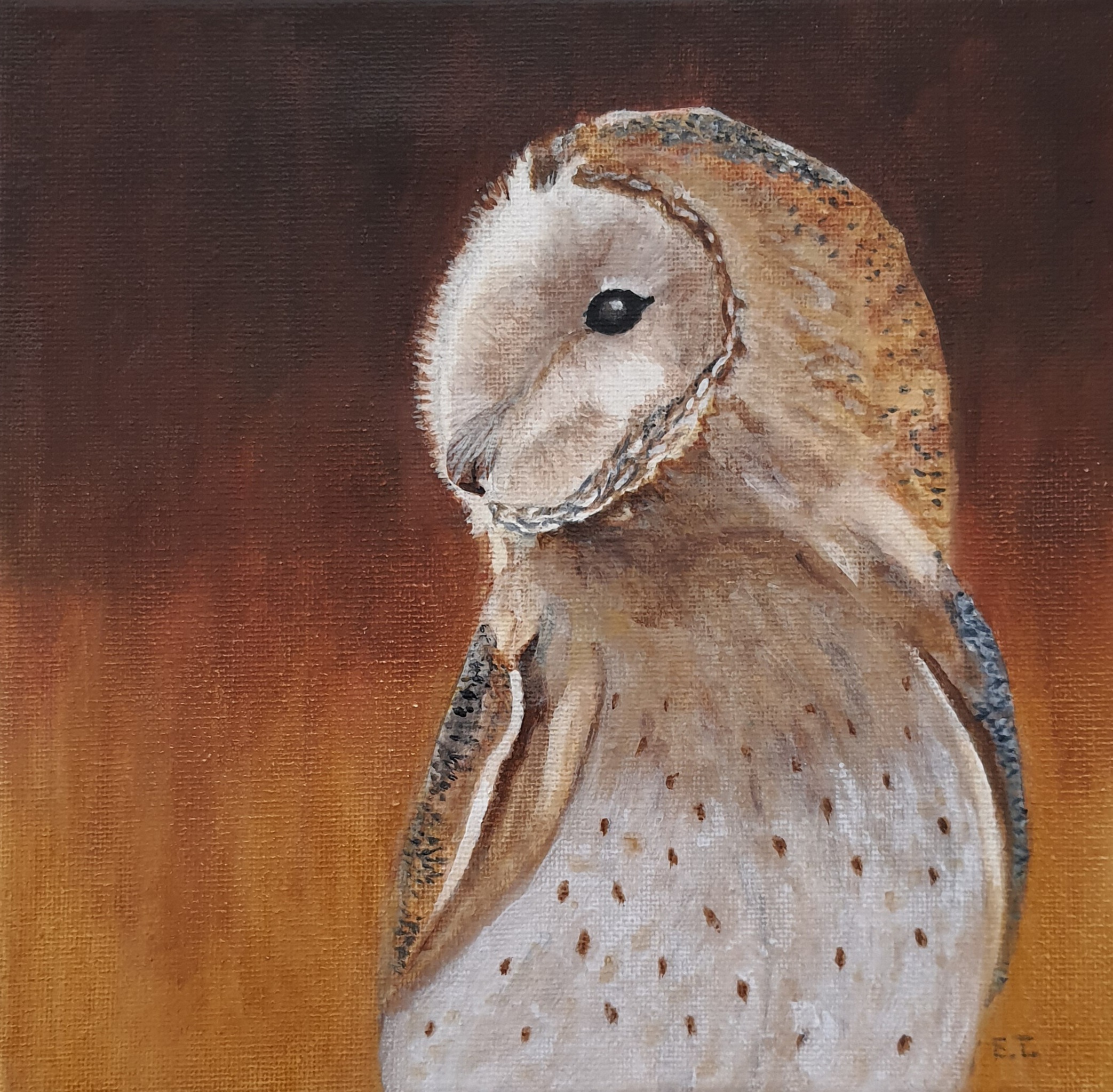 Een klein kerkuiltje op doek in mooie warme kleuren.