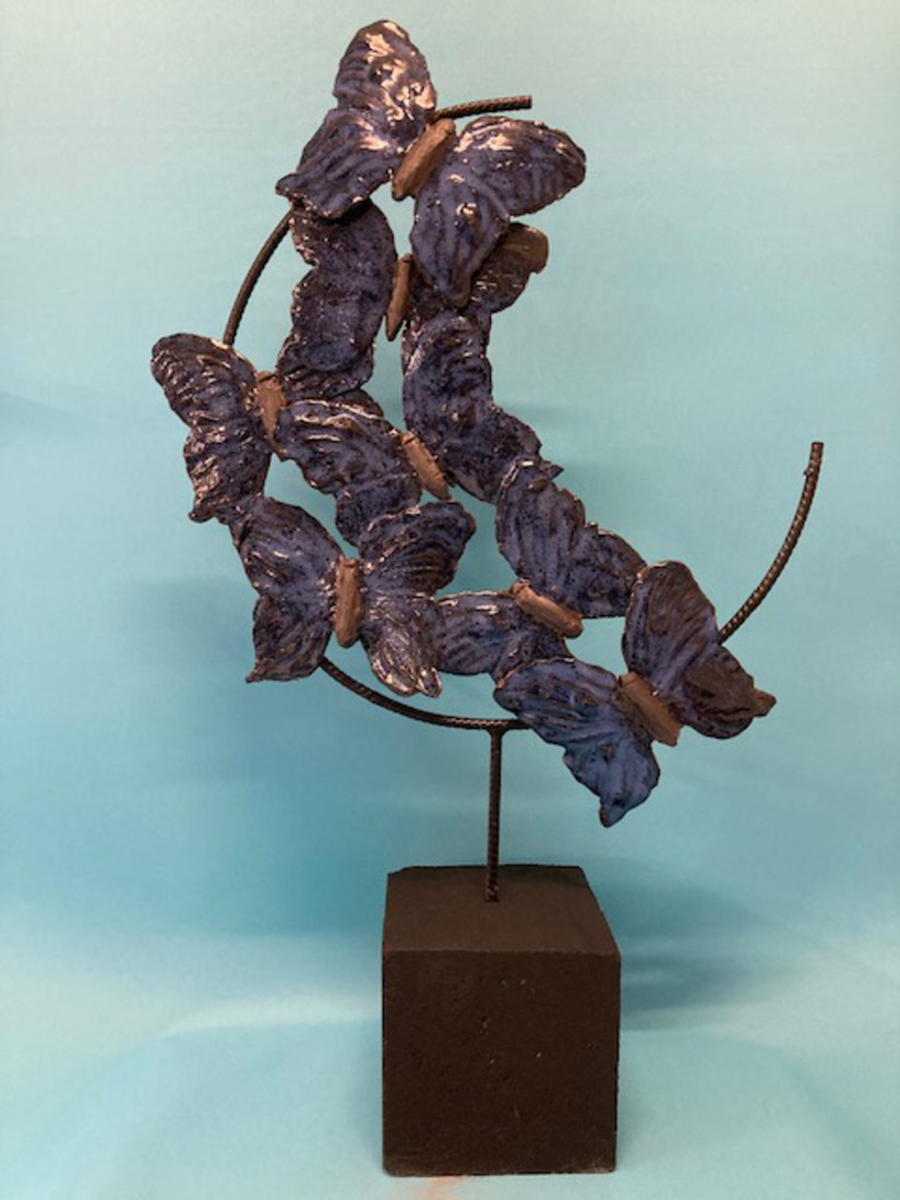 Pachtige zwerm van blauwe vlinders . Vliegend door metalen ring met opening, de zon tegemoet! Op zwart gemaakte betonnen sokkel. Deze is verkocht, maar in opdracht te maken, in de kleuren zoals gewenst.