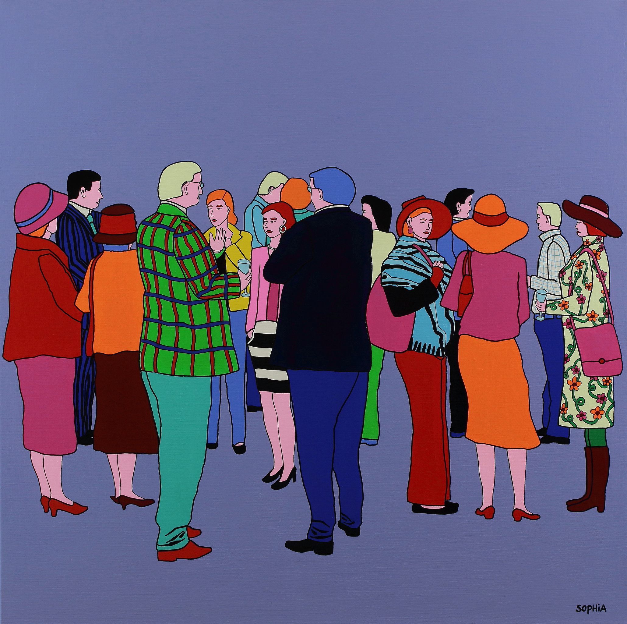 Ontmoetingen tijdens de opening van een expositie. Het schilderij is afgewerkt met een vernislaag. De zijkanten van het werk zijn meegeschilderd. Het schilderij heeft een aluminium frame met verschuifbaar ophangsysteem.