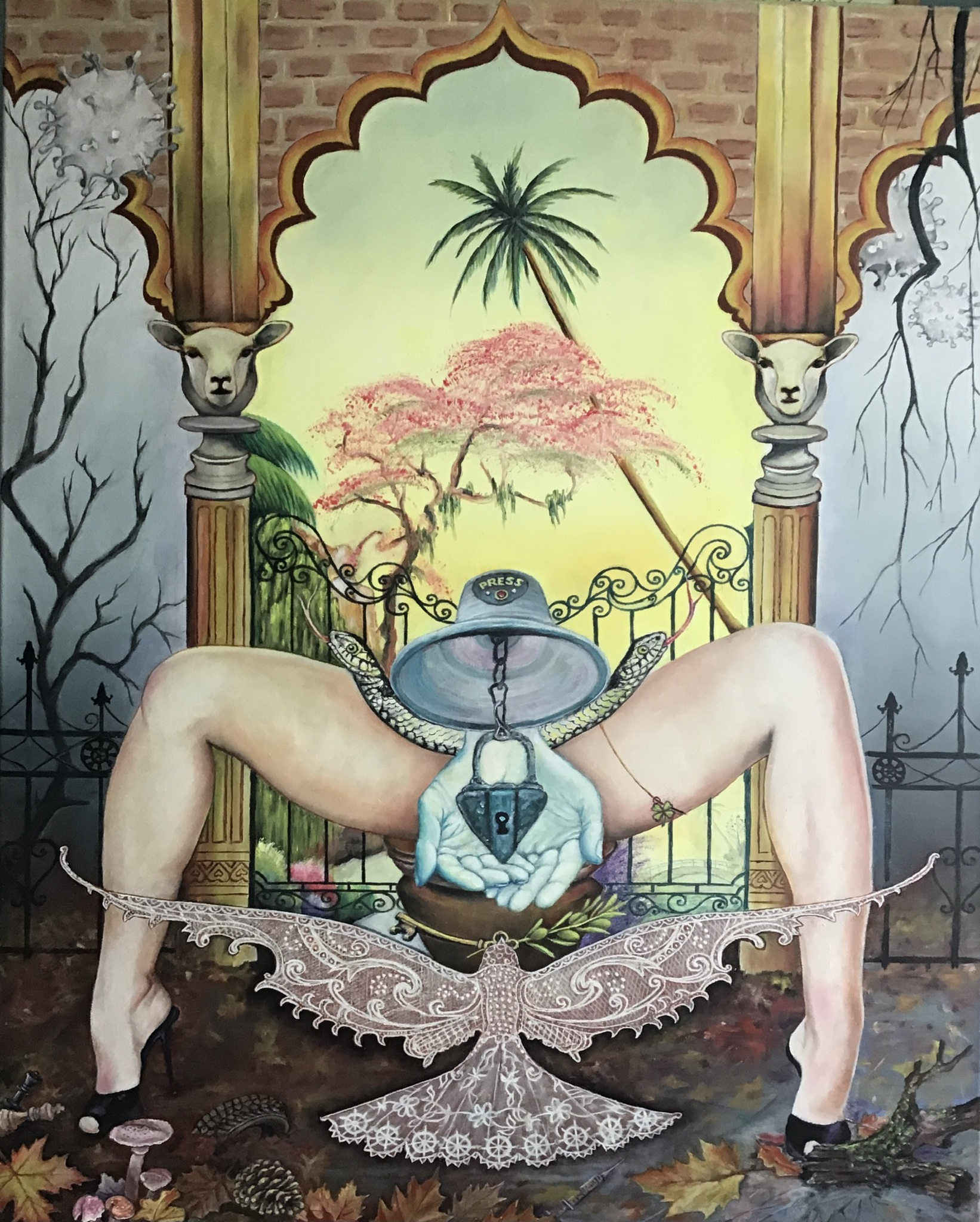 Mijn indruk over Coronawaanzin. De herfst i(Corona ) . Achter de gesloten poort , de zomer, het normale leven. De duif brengt de sleutel naar vrijheid .