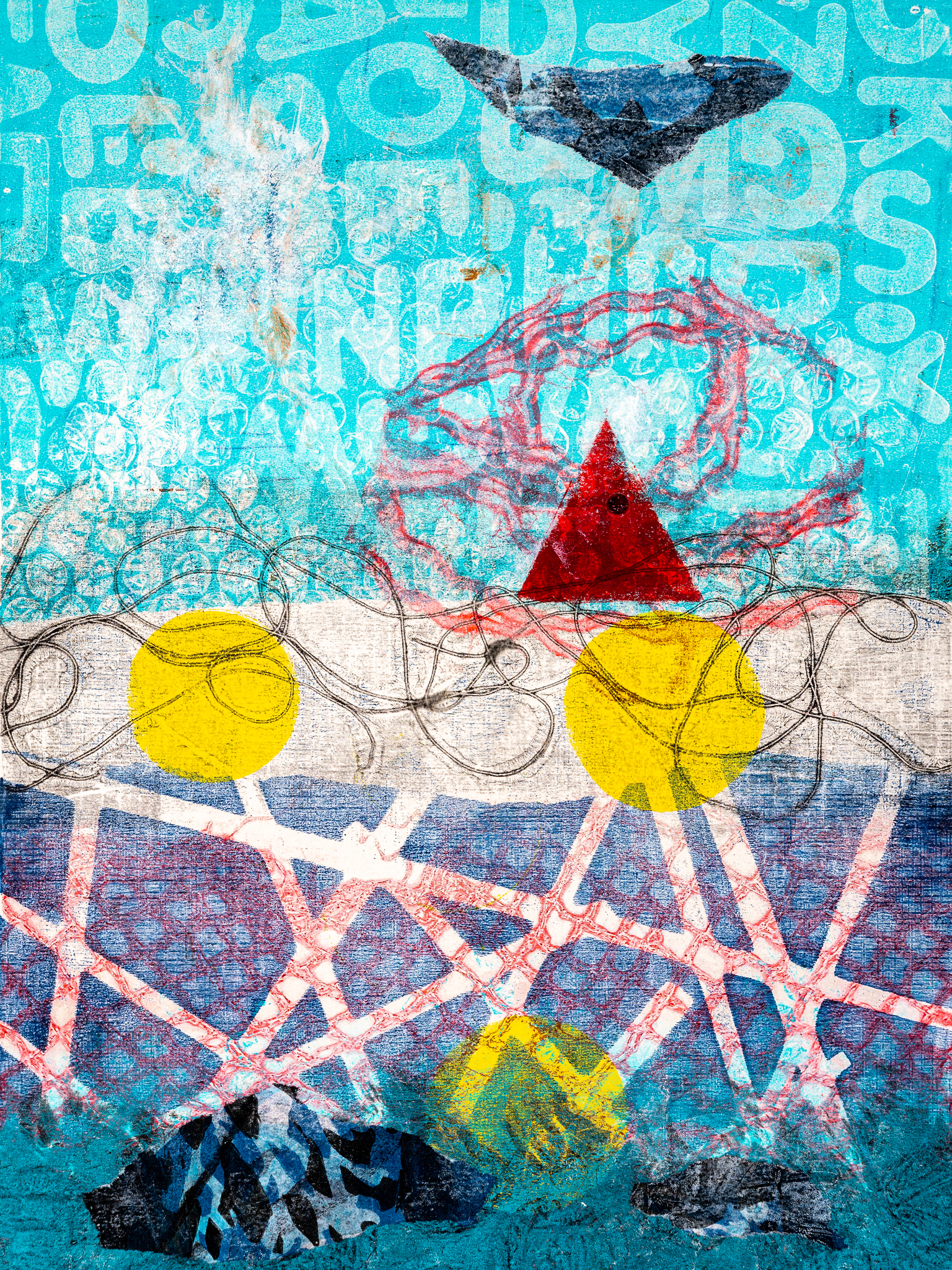 Monotype Monoprint Blauw Rood Piramide Abstract Lijnen