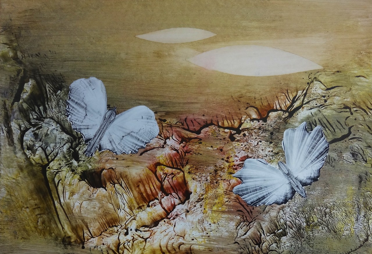 Ik werk impulsief,gedreven en intuïtief.De natuur is mijn grootste inspiratiebron.De landschappen in mijn etsen en monotypes stralen een bepaalde sfeer uit:romantisch,dreigend, verlaten en spannend.Het onderwerp kan beïnvloed worden door iets inspirerends wat op mijn pad komt.Naar aanleiding van een bezoek aan de voorraadkelders van de oude medische instrumentenwinkel van A. van der Kuip te Utrecht,heb ik met dit medisch materiaal zowel ruimtelijk werk,dozen en glazen boxen,als vlak werk gemaakt waaronder monotypes,clichedrukken,collages en tekeningen.