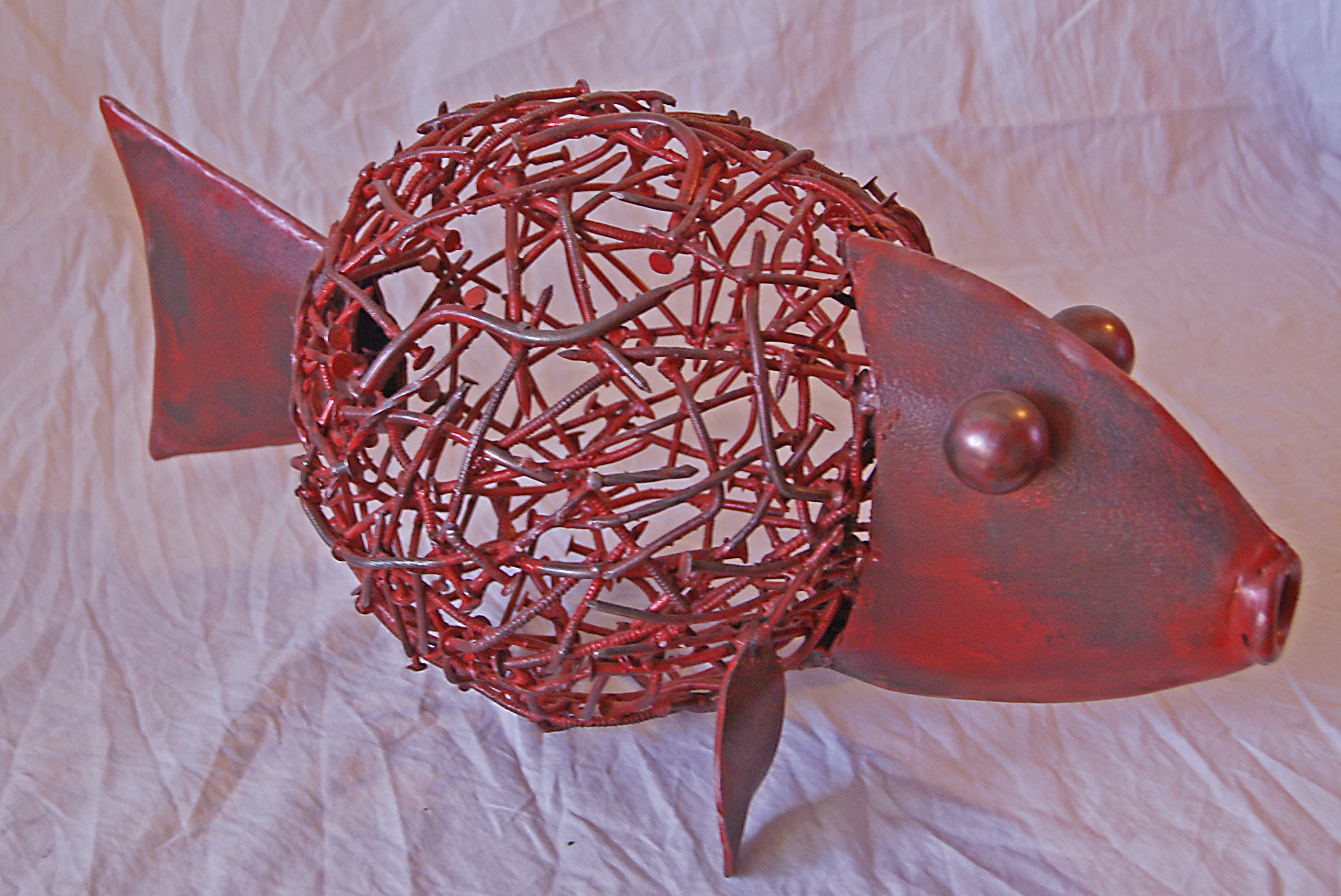 Kogelvis. De body is vervaardigd van gebruikte draadnagels die als een soort van breiwerk aan elkaar zijn gesmeed. De kop en vinnen zijn van cortenstaal gesmeed. Het geheel verlevendigd in een rode tint.