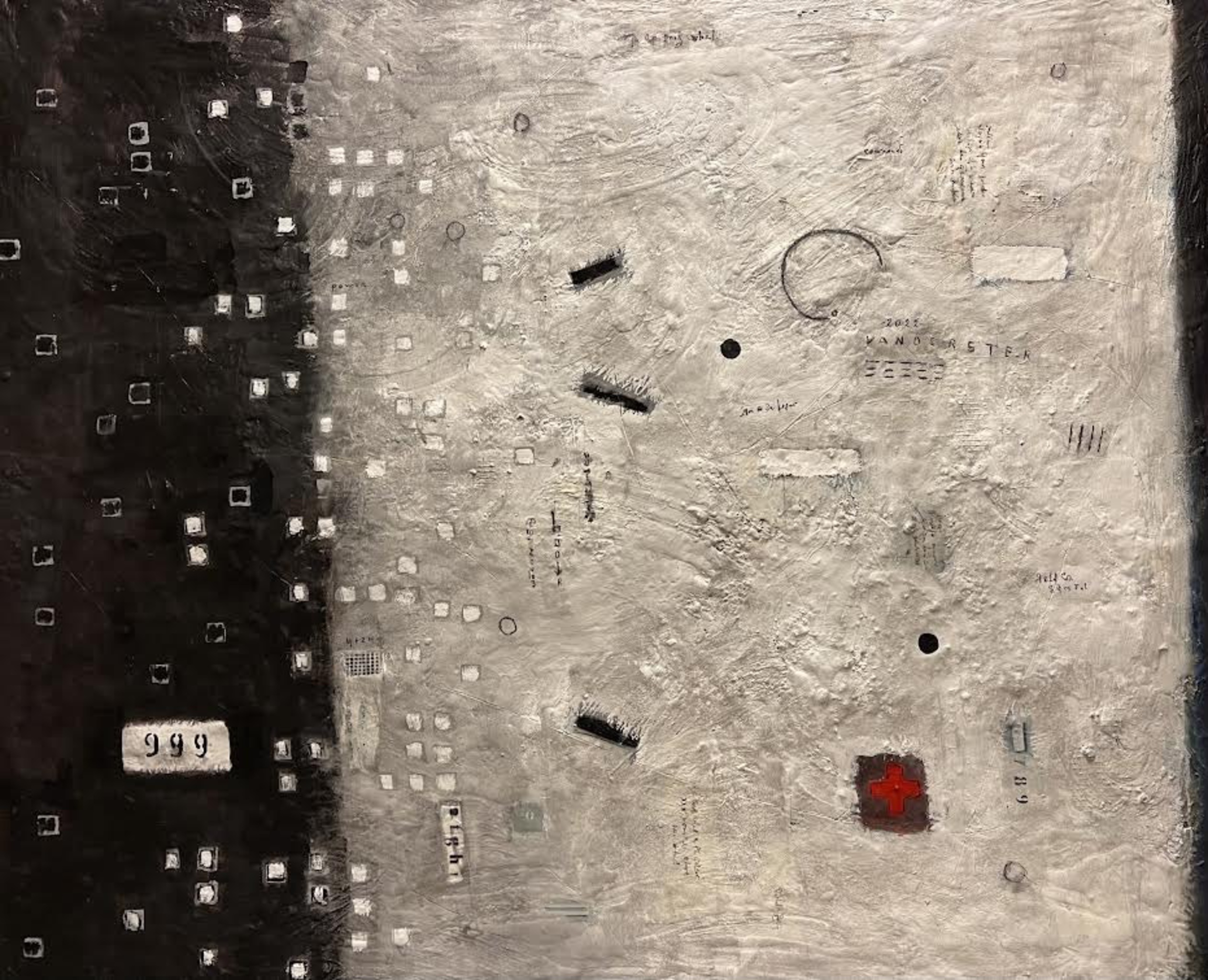 Schilderij opgebouwd uit symbolen, archetypische vormen en tekens.