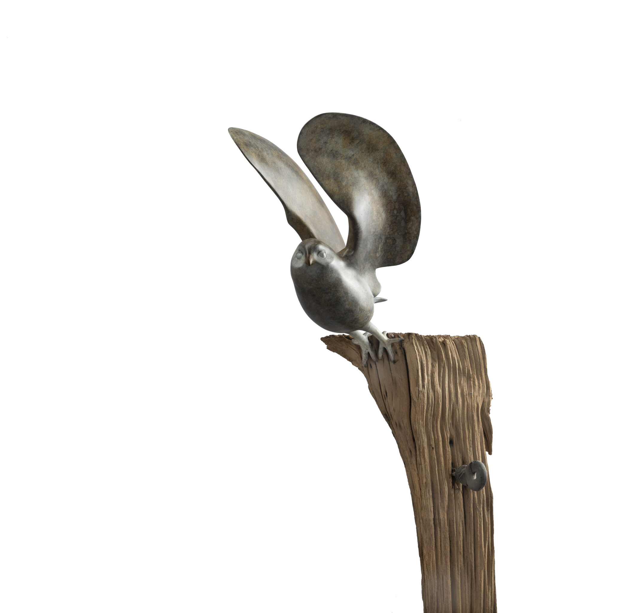Brons gepatineerde uil op houten weidepaal