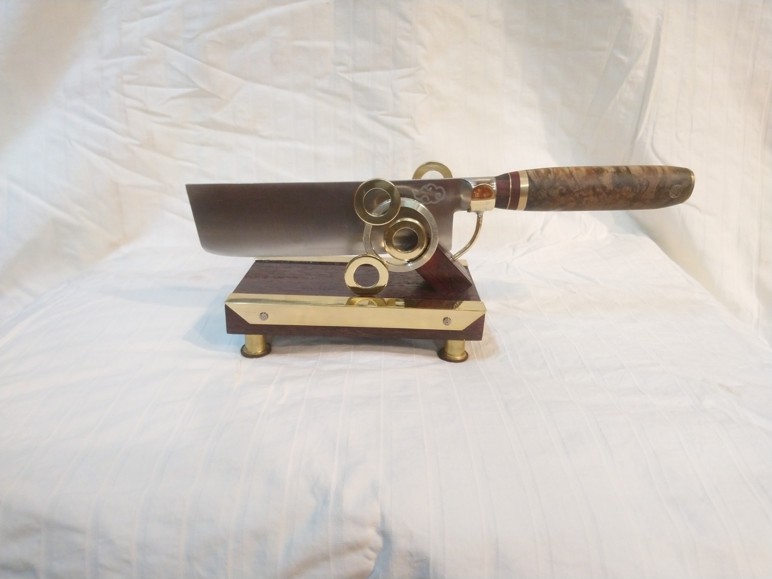 Deze Japanse hakmes heb ik samen met mijn nicht gemaakt We hebben een nieuwe handvat gemaakt aan een bestaande hakmes ,en er een aparte standaard voor gemaakt . We wouden een aparte standaard die er anders uitzag dan de standaard messen blok