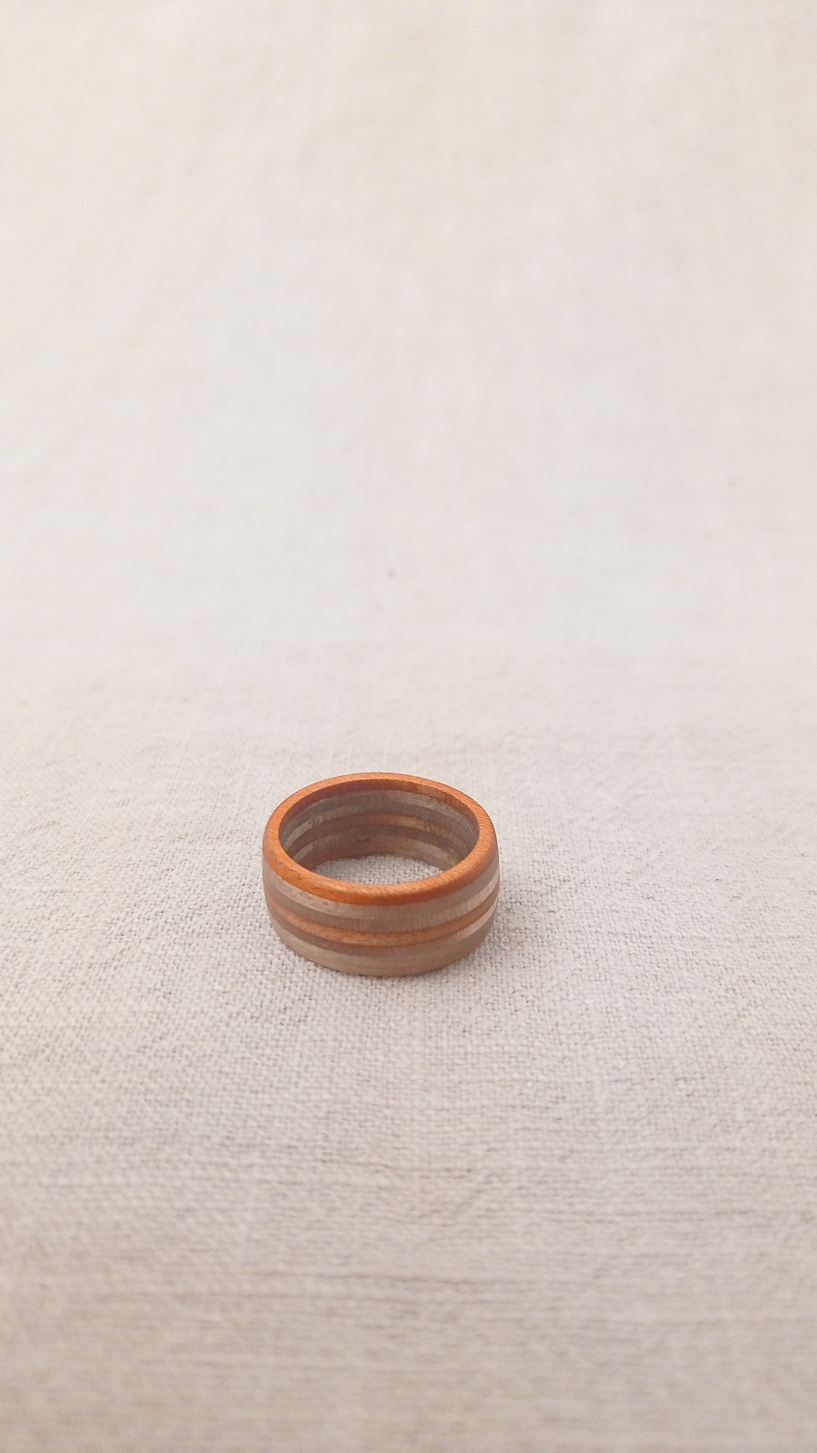 Deze ring is gemaakt uit een oud stukje skateboard.