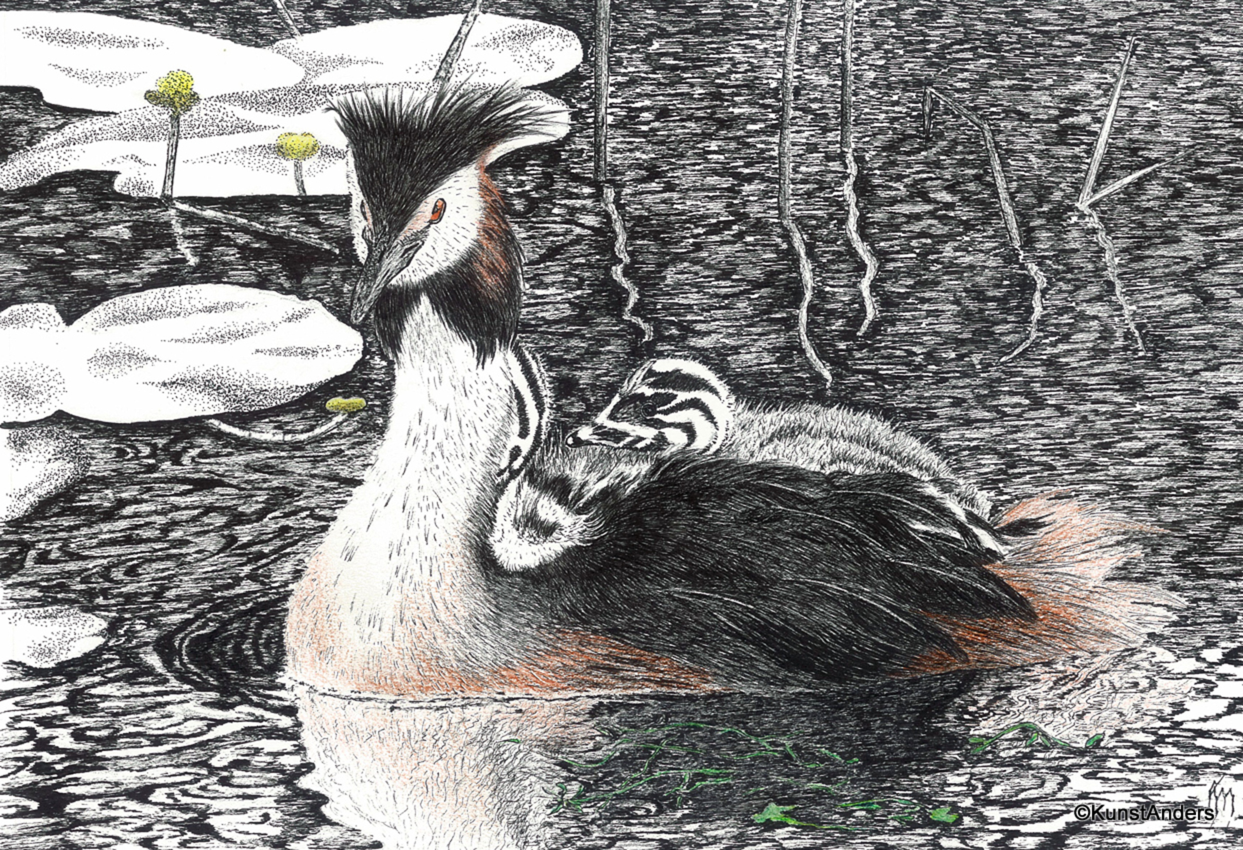 Wildlife Dieren Natuur Inkt Pen Lente Vogels Voorjaar Kleurpotlood Eend Pentekening Tekenpen Fuut Derwent Staedtler Kunstanders Pulletje