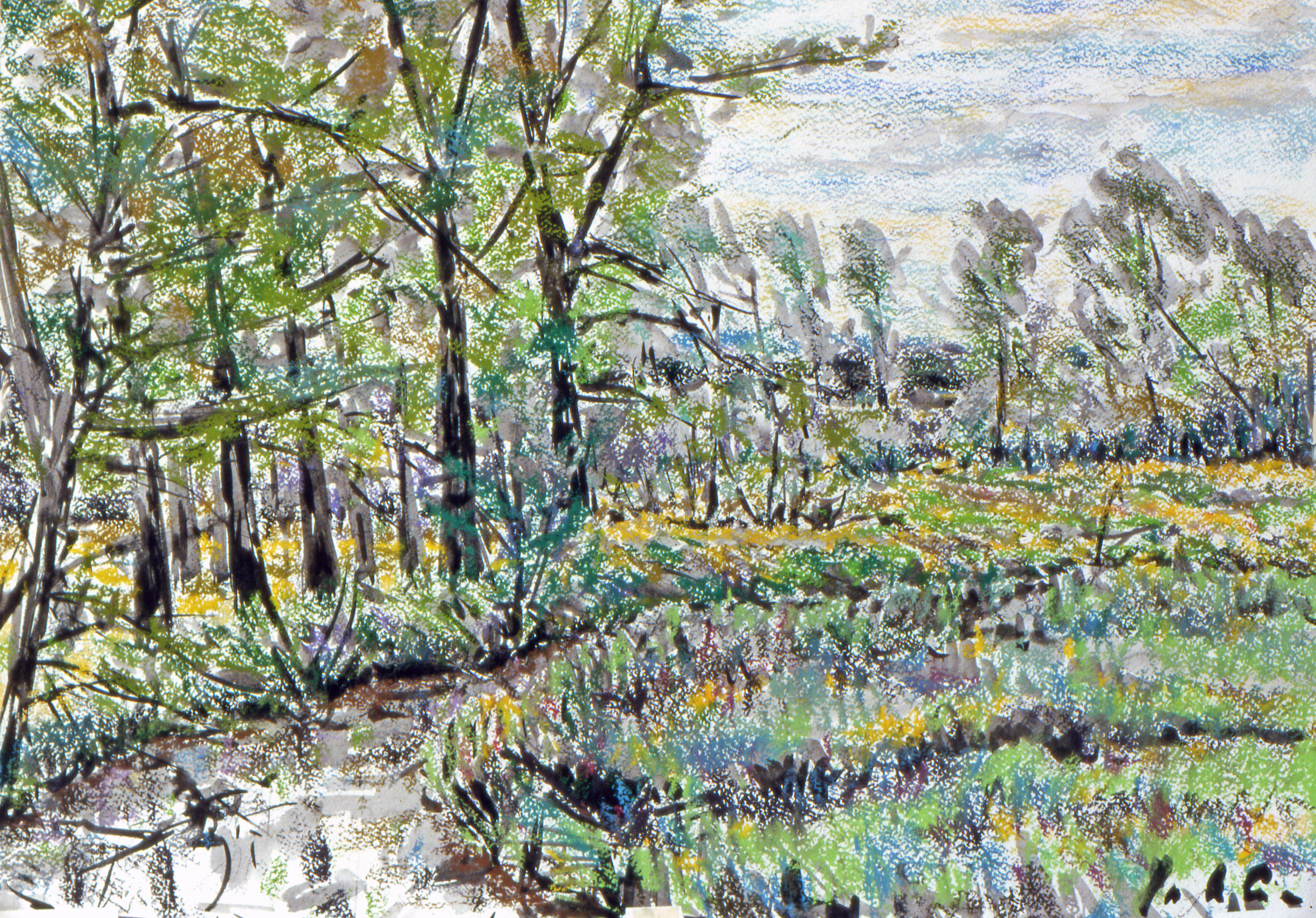 Tijdens het 8-jarige verbijf in het heuvelland van Zuid Limburg heeft Ton veel buiten gewerkt. Hij maakte een vlotte schets van zijn onderwerp in oostindische inkt en werkte het daarna uit met softpastel.