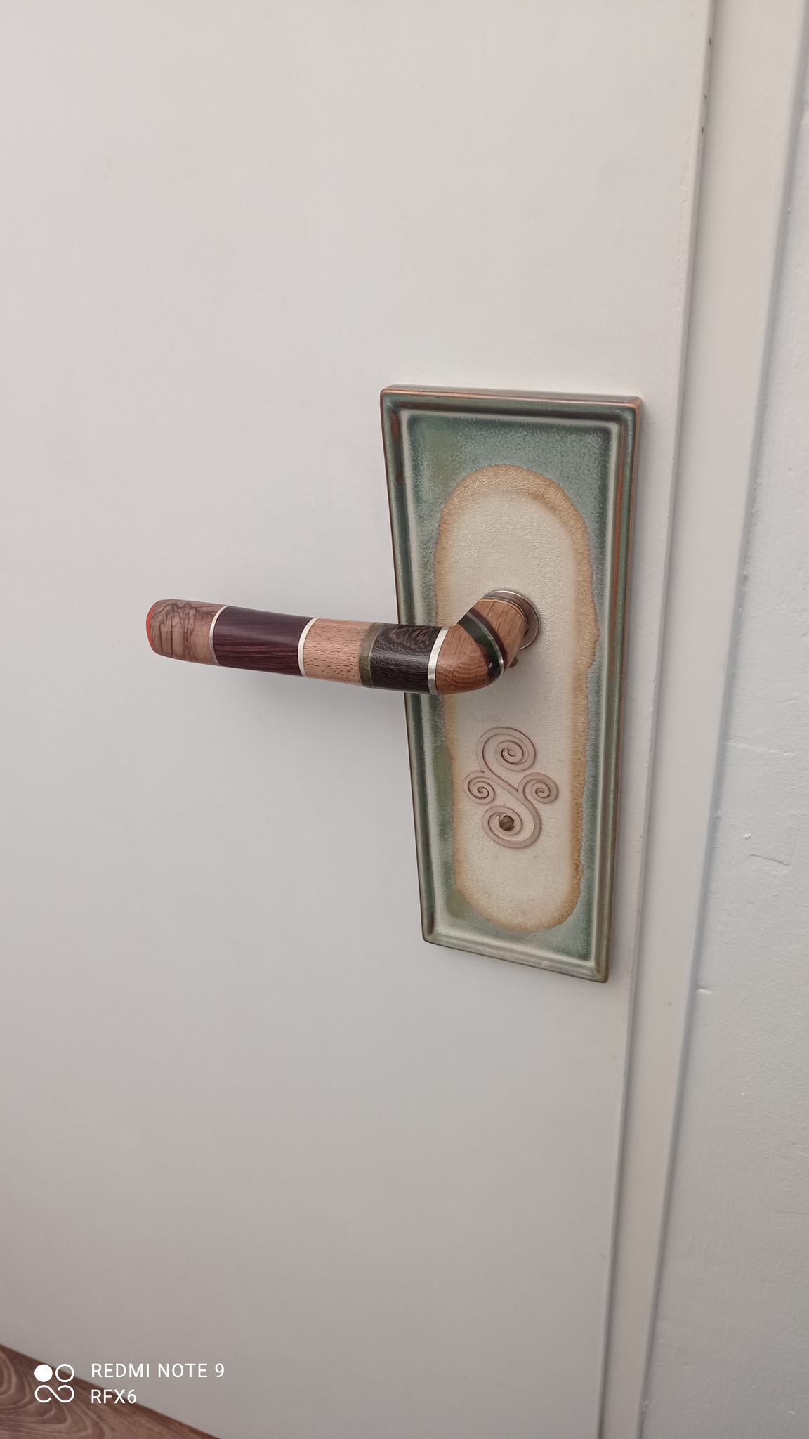 Een deur kruk gemaakt van oranje plexiglasOlijf hout,aluminium,cocobolo,witte pvc,eiken,en wenge. De plaat is een platte olijf schaal