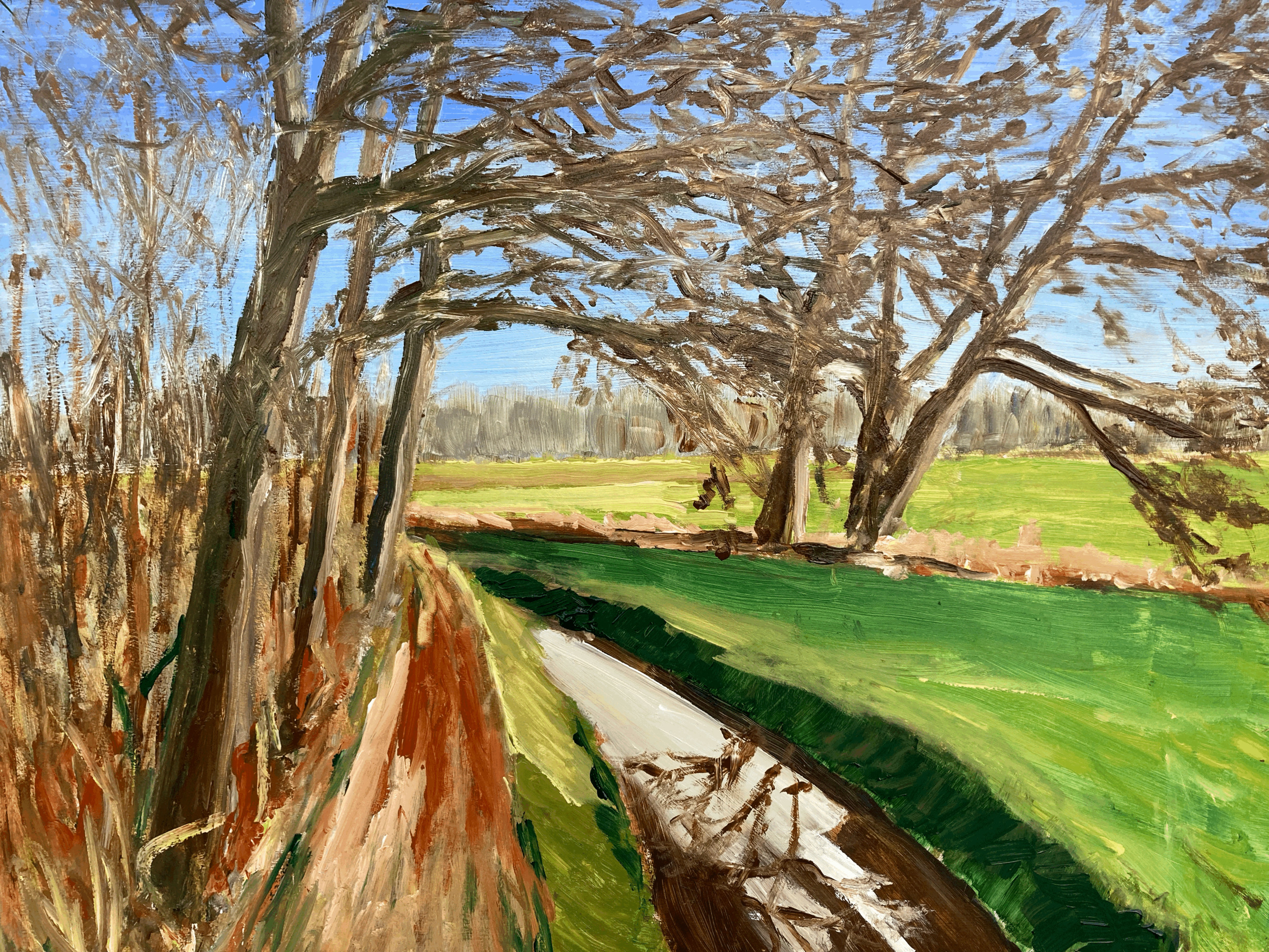 Plein air acryl schilderij. Sloot langs bosrand in de Slangenburg.