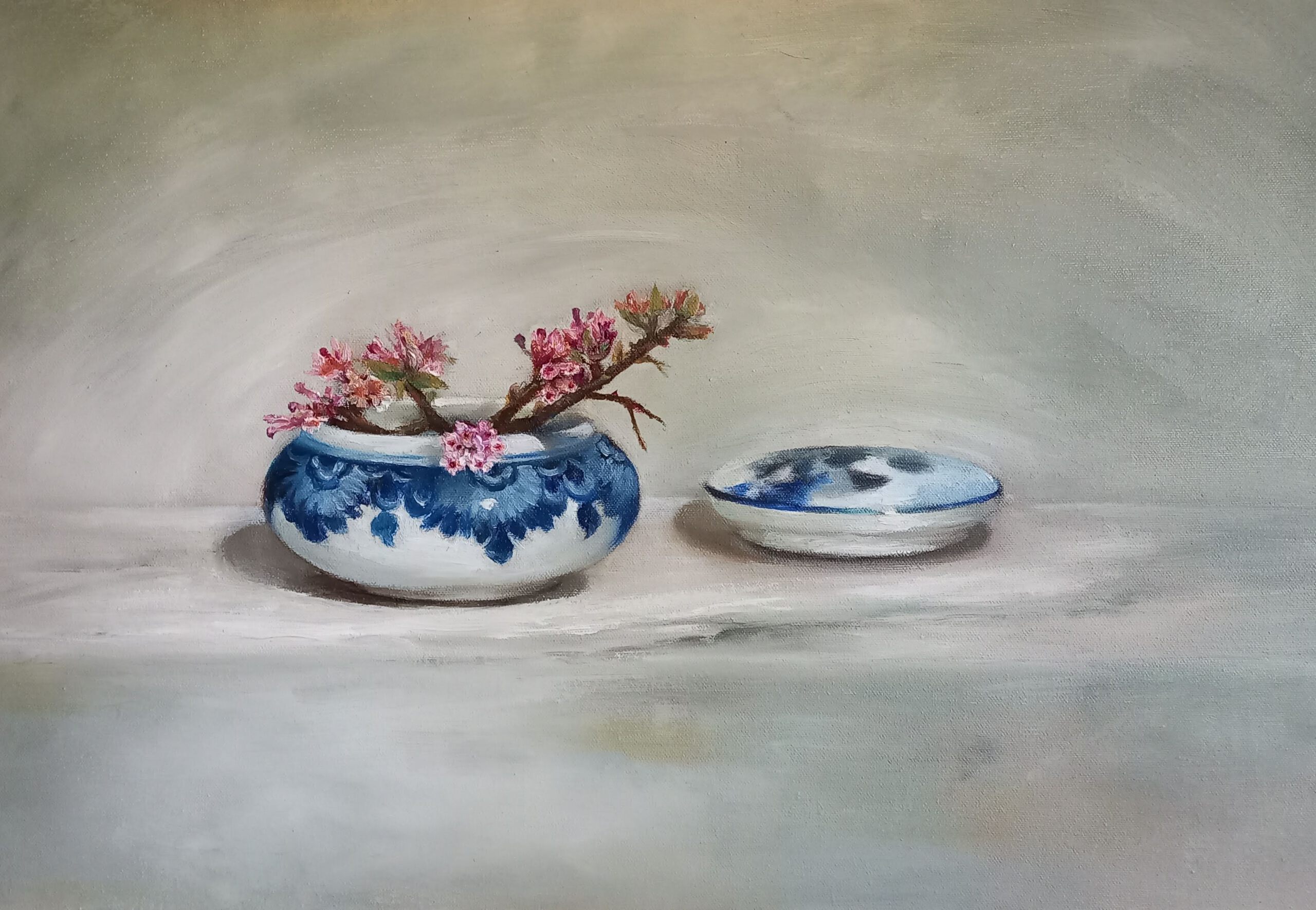Figuratief Realistisch Olieverf Doek Schaaltje Delftsblauw Deksel Winters Takjes Viburnum