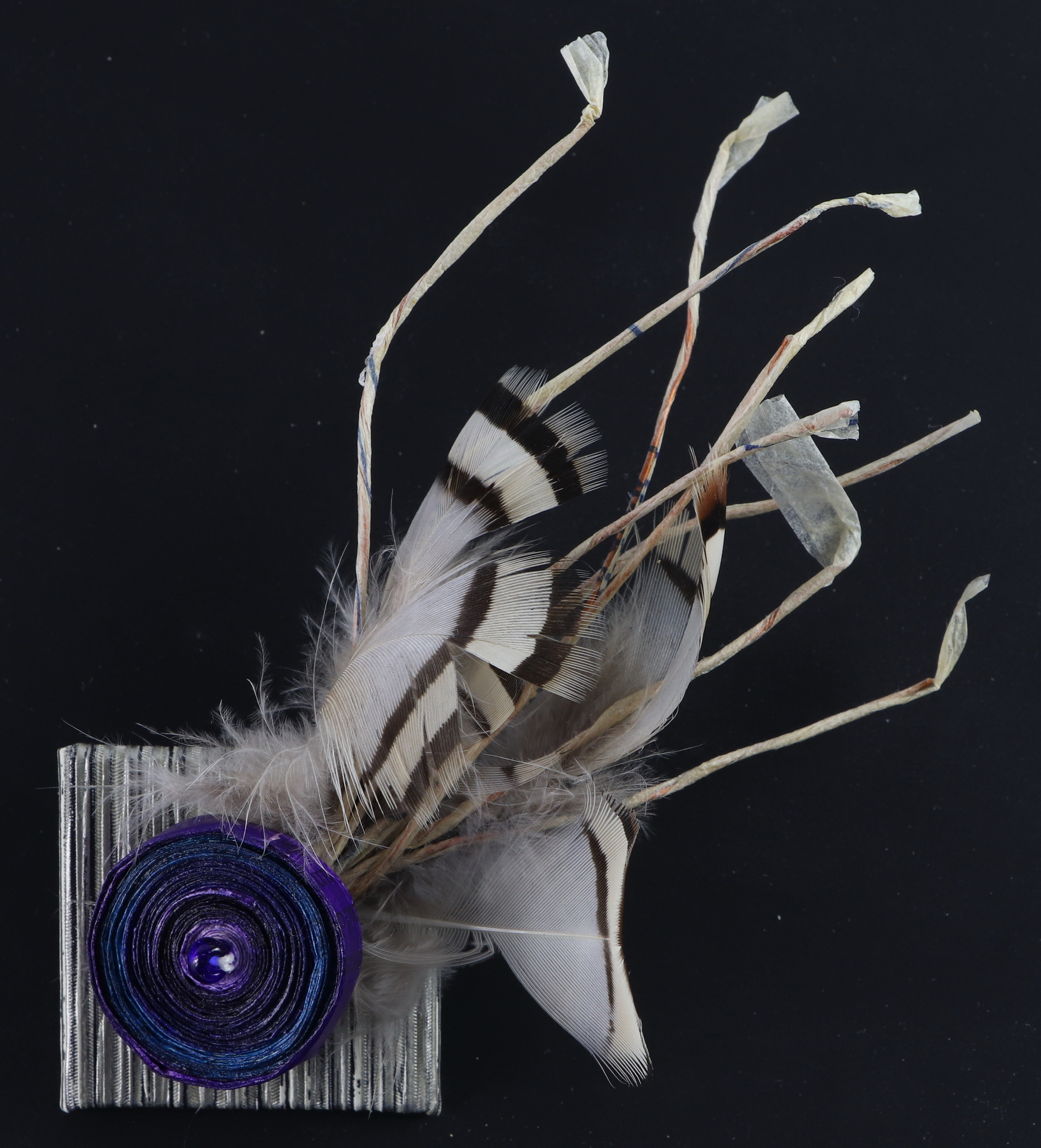 Papier geverfd met acrylverf. Broche verder versierd met veren bevestigd op koperdraad omwikkeld met papier. Broche afgewerkt met acryllak ter bescherming