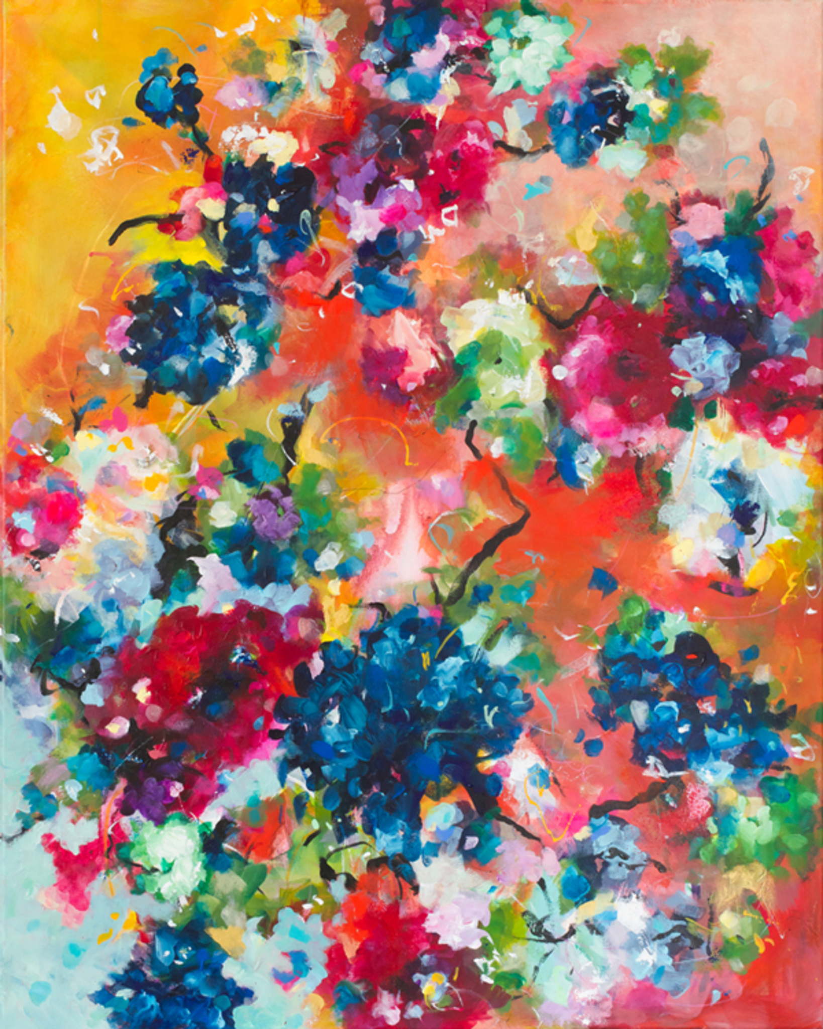Een passievol warm bloemrijk werk. De grillige dynamiek stuurt je oog over het beeld om van kleur naar kleur, vorm naar vorm op te gaan in een kolkend spel van penseelstreken. Ingelijst in zwarte baklijst. Ook verkrijgbaar als print (zie qeimoy.com).