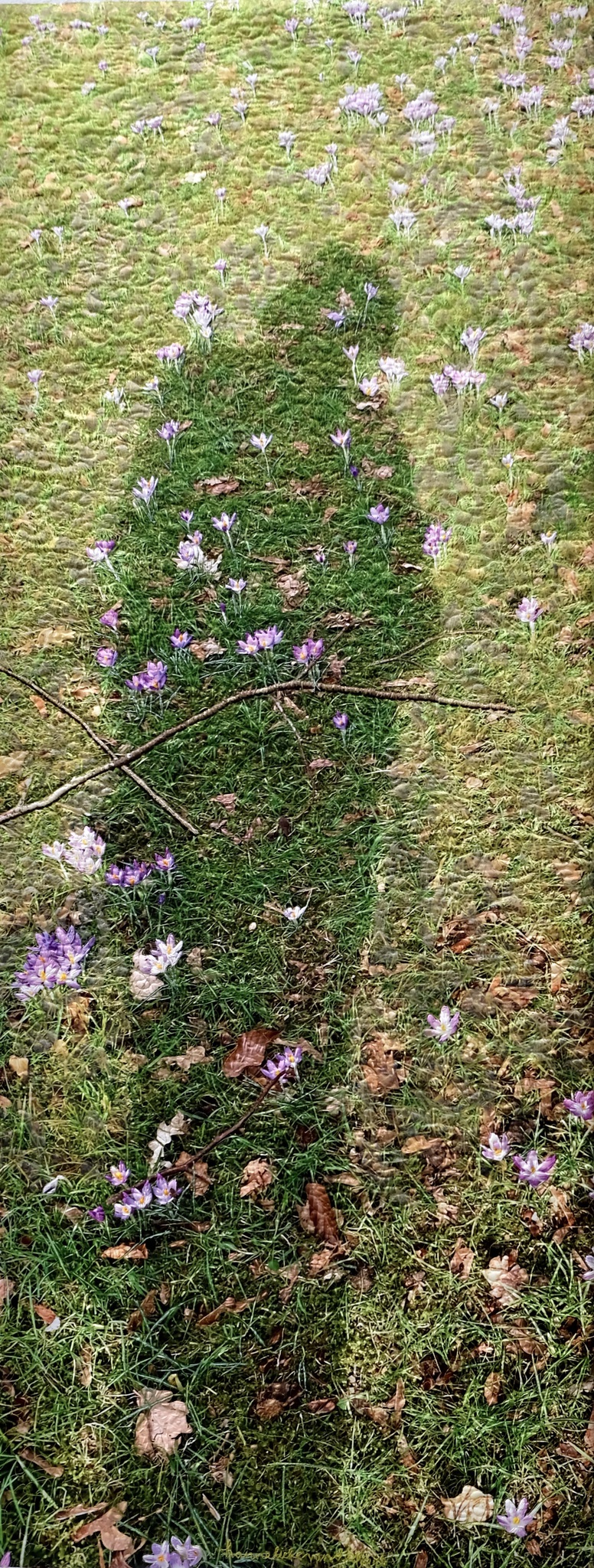 Groen Gras Krokusjes Kruis Schaduw Rabboeni Tuinman Textiel Borduren
