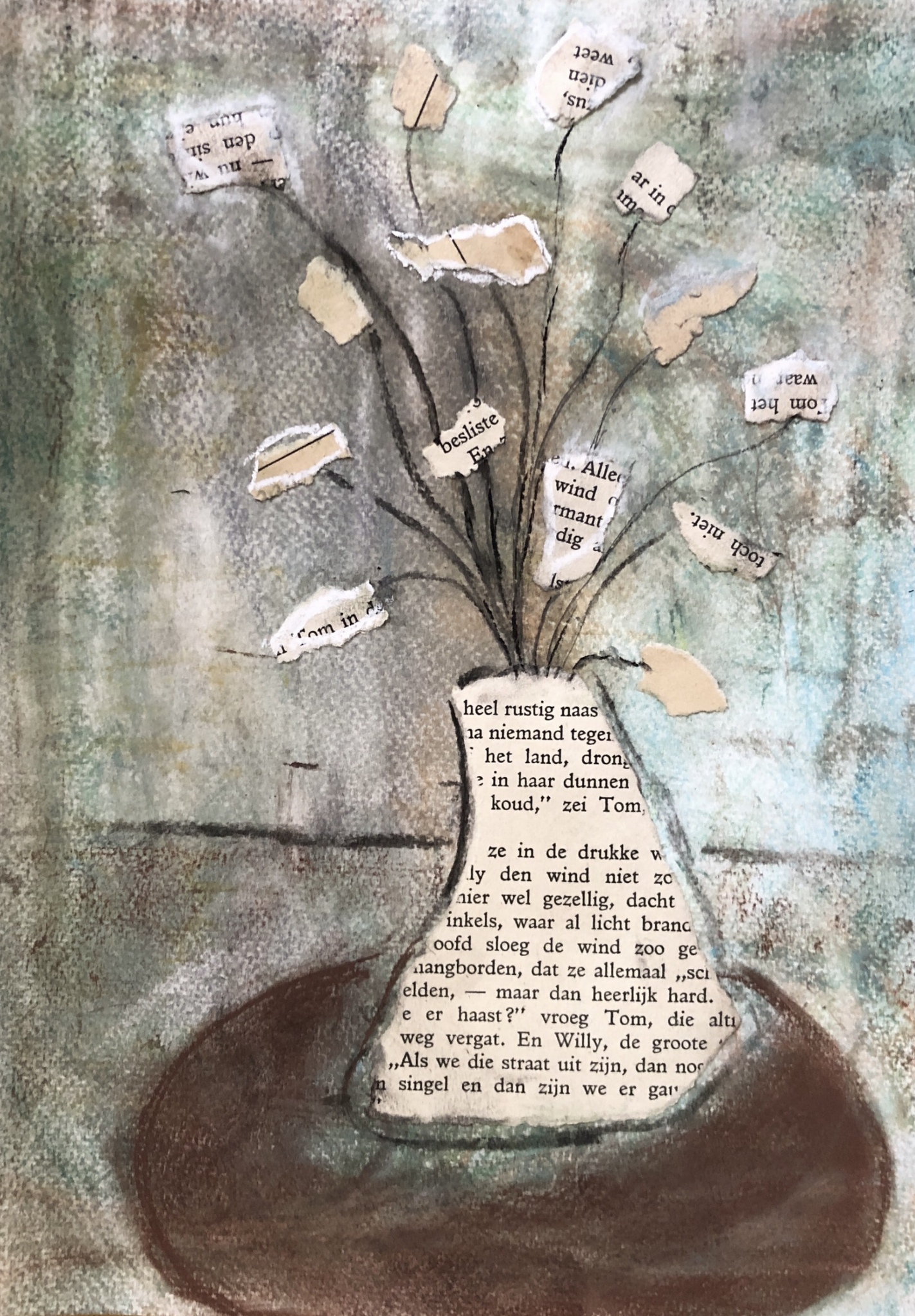 collage van vaas met bloemen, papier (oud boek) en krijt, inclusief pass partout