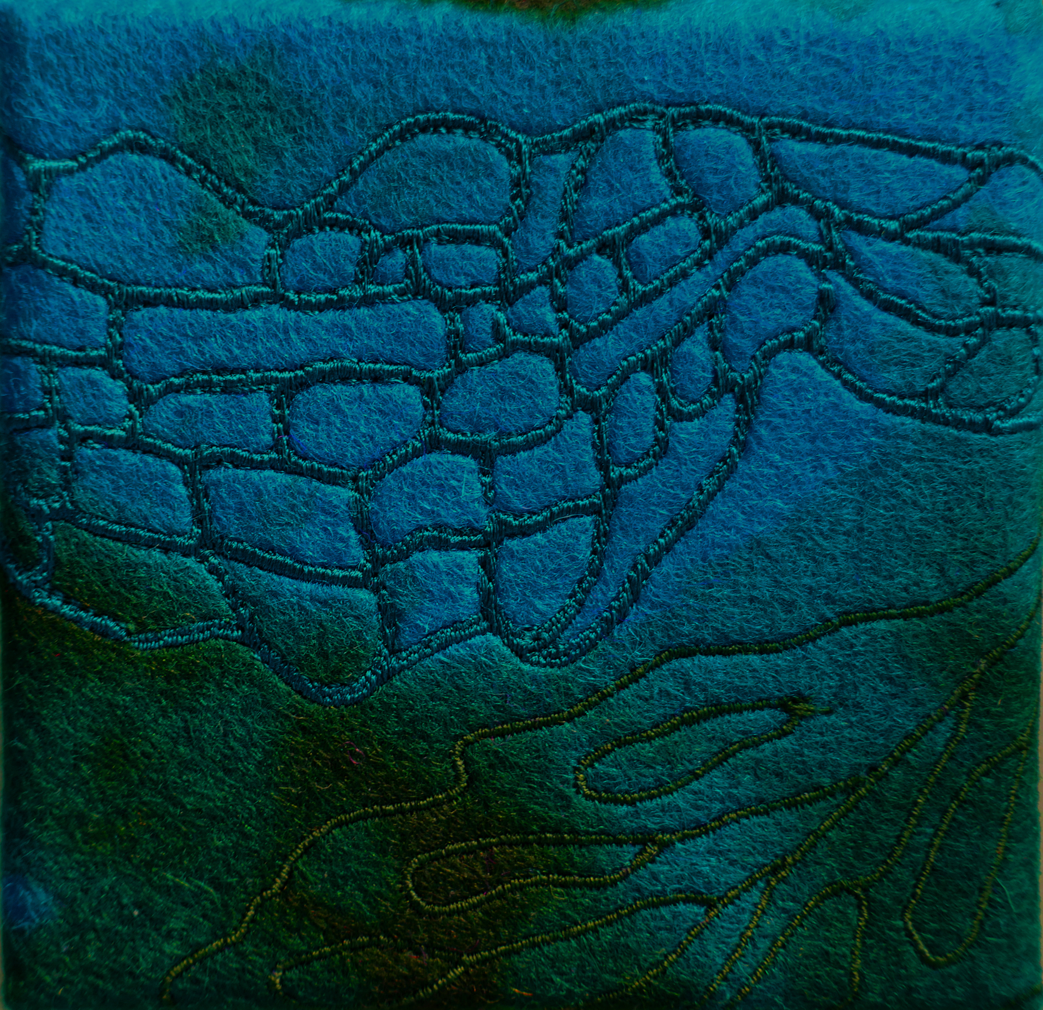 walnoot geverfd wolvilt, glansgaren, borduurzijde.