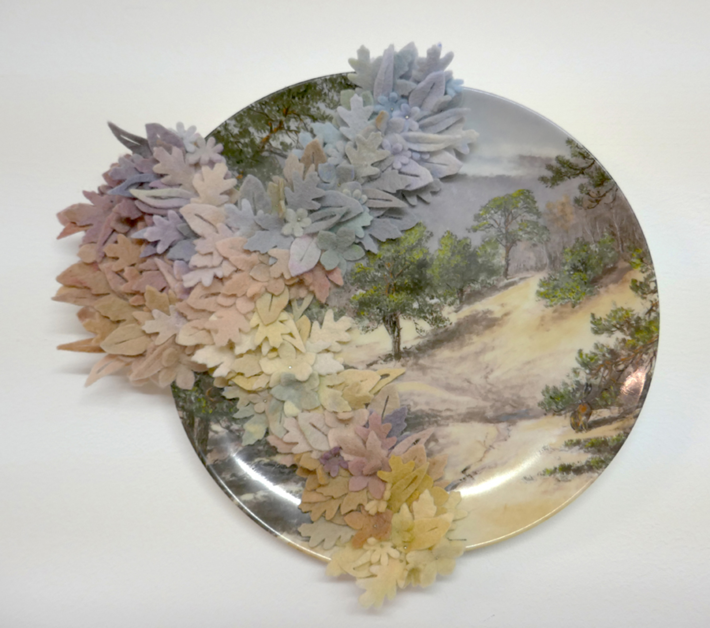 Deels handgeverfd wol vilt, kapot keramiek, borduurgaren, spelden.