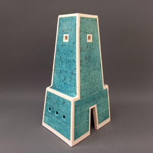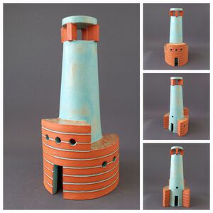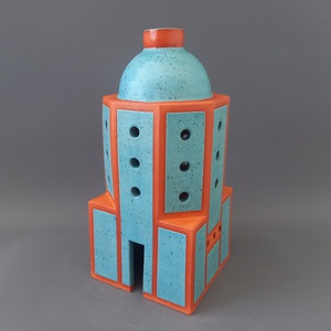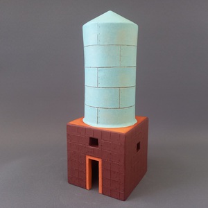 Ellipsvormige watertoren met cirkelvormige entree. Rode klei met blauwe glazuuraccenten.