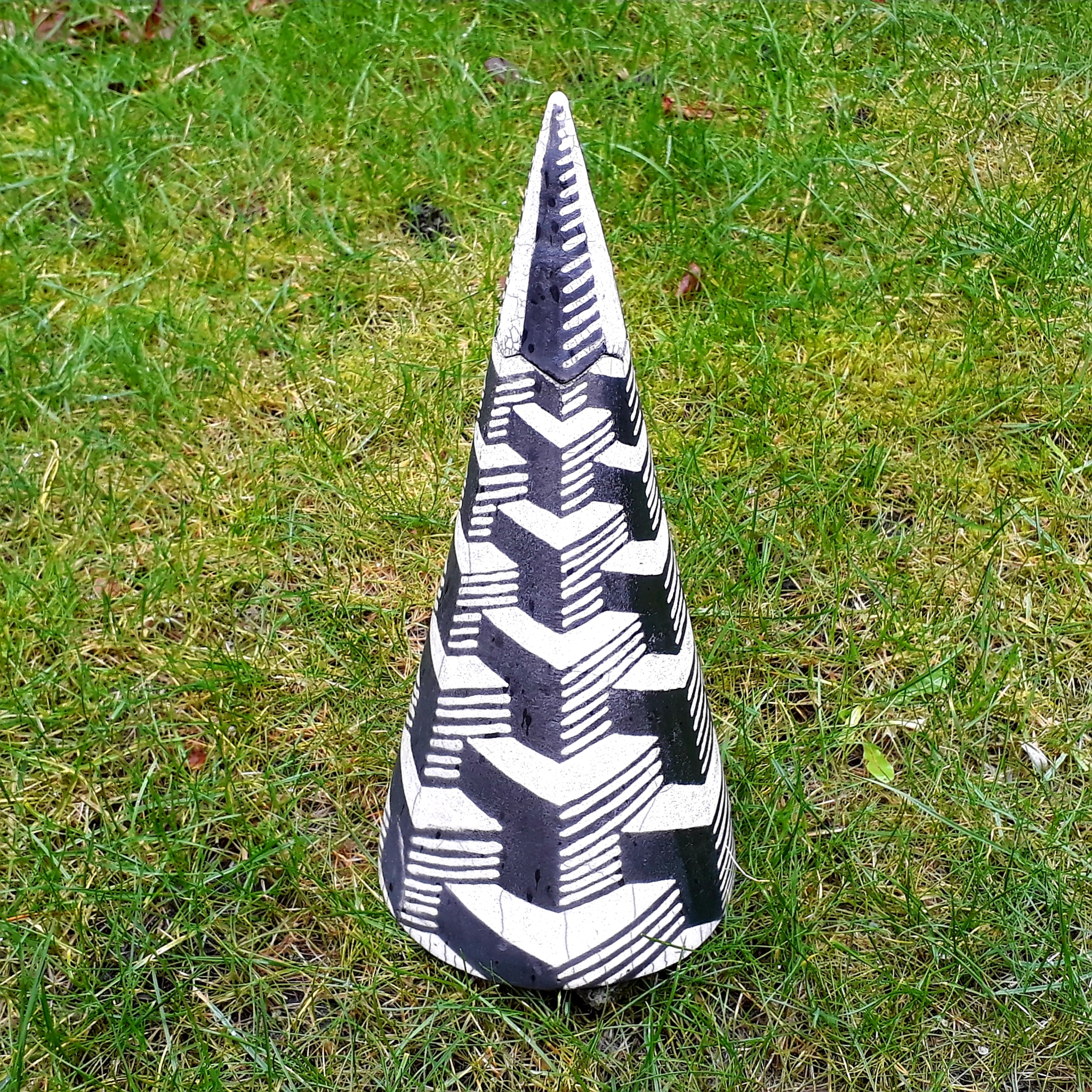 Kegelobject met Escherachtig motief. Onderdeel van een tweetal kegelobjecten. Als object of als vaas (zonder top) te gebruiken.