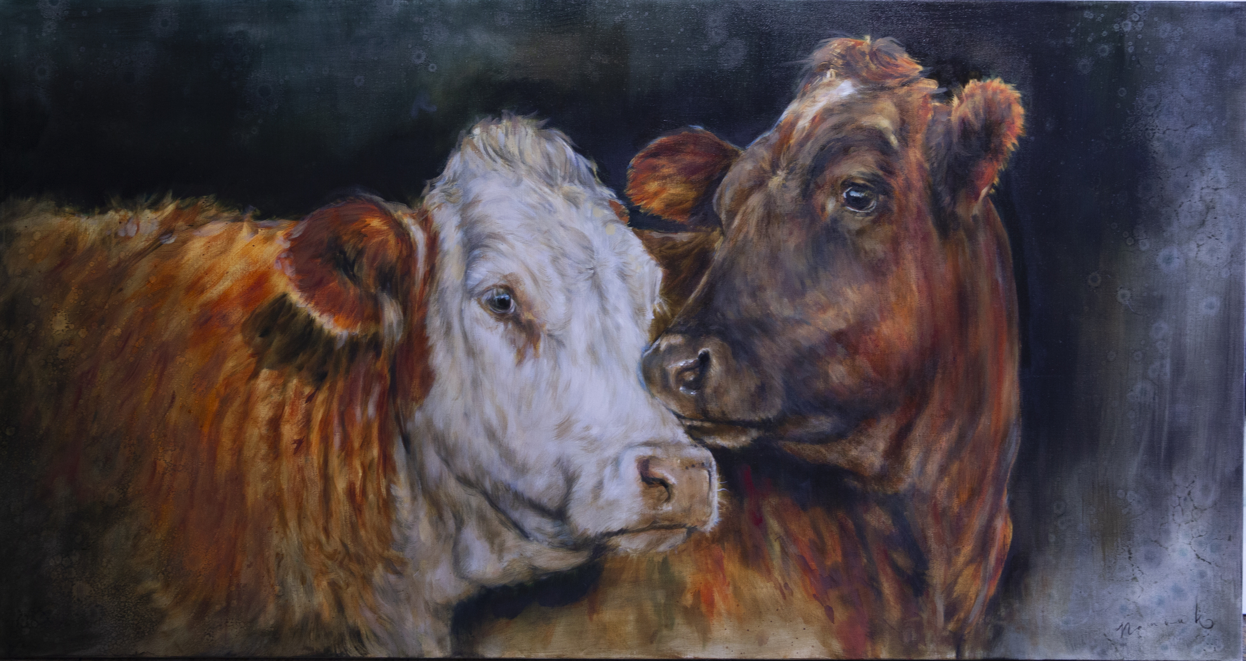Langwerpig groot olieverfschilderij van 2 knuffelende koeien