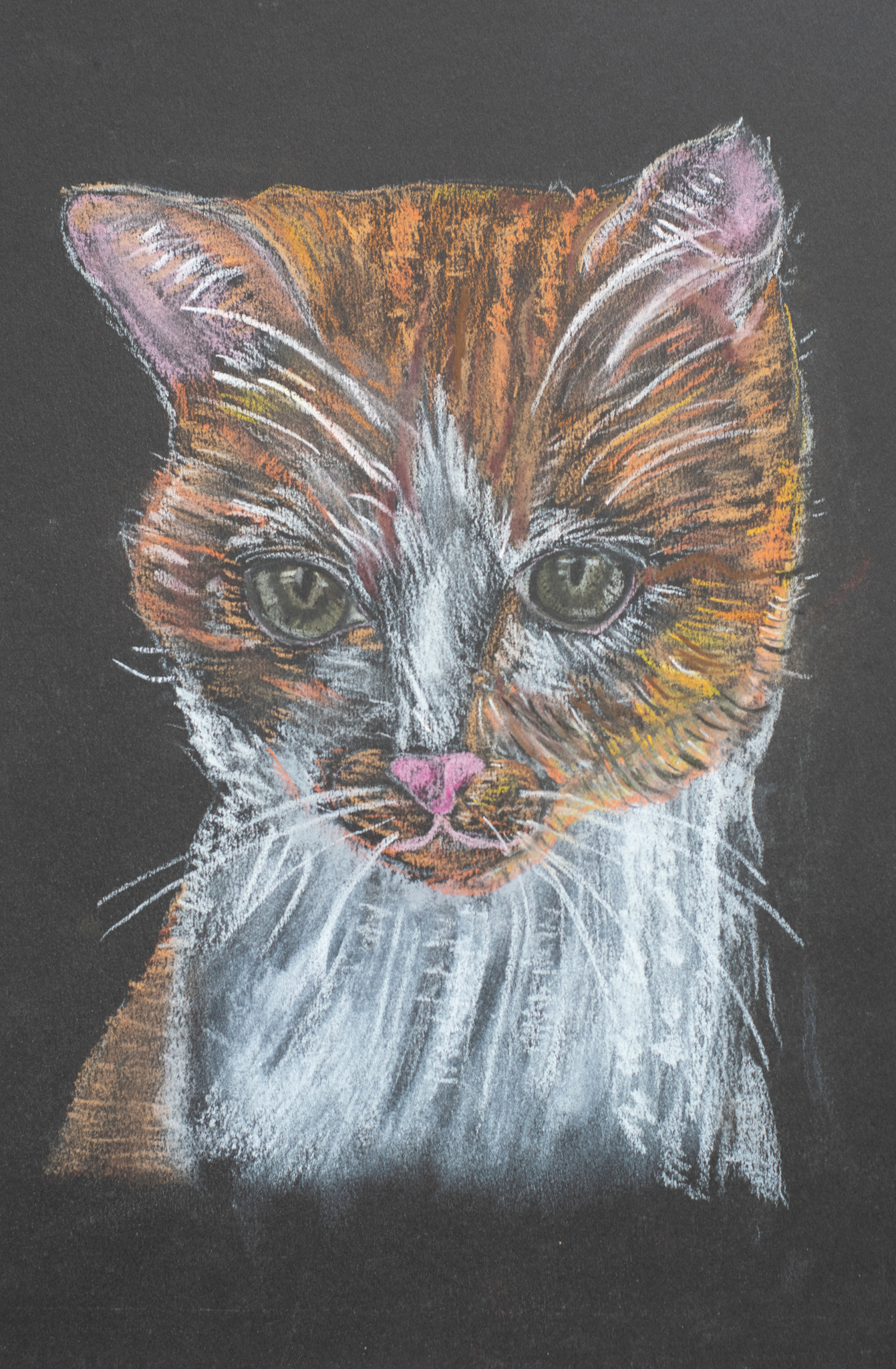 Schattig poesje met zijn mooie rode kleur vacht. Getekend op papier met pastelkrijt.